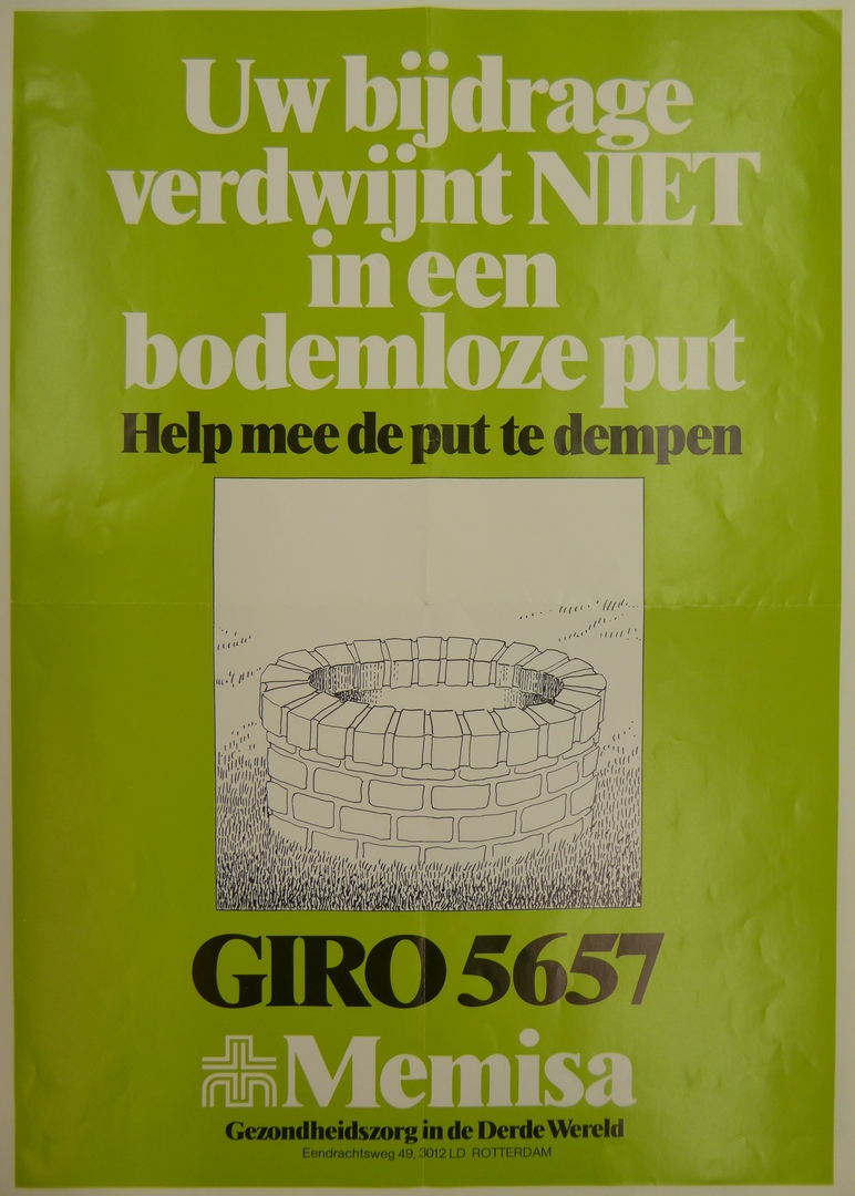 Affiche "Uw bijdrage verdwijnt niet in een bodemloze put, Memisa Rotterdam"