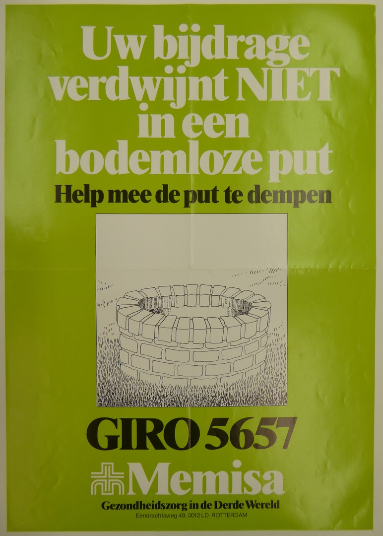 Affiche "Uw bijdrage verdwijnt niet in een bodemloze put, Memisa Rotterdam"