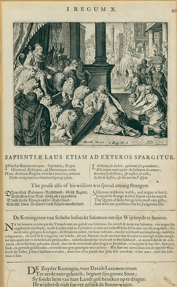 Gravure van de koningin van Sheba geknield voor de troon van koning Salomo. De koningin van Sheba heeft een groot gevolg bedienden met geschenken en kamelen. Op de traptreden van de troon van Salomo zitten Leeuwen. Onder de grafure staat de betreffende passage uit het bijbelverhaal in vijf talen (Latijn, Frans, Duits, Engels, Nederlands) en ...