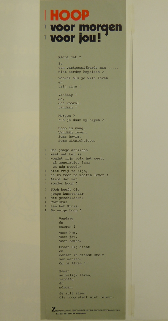 Affiche in twee delen: een strook met tekst, hoop voor morgen, voor jou