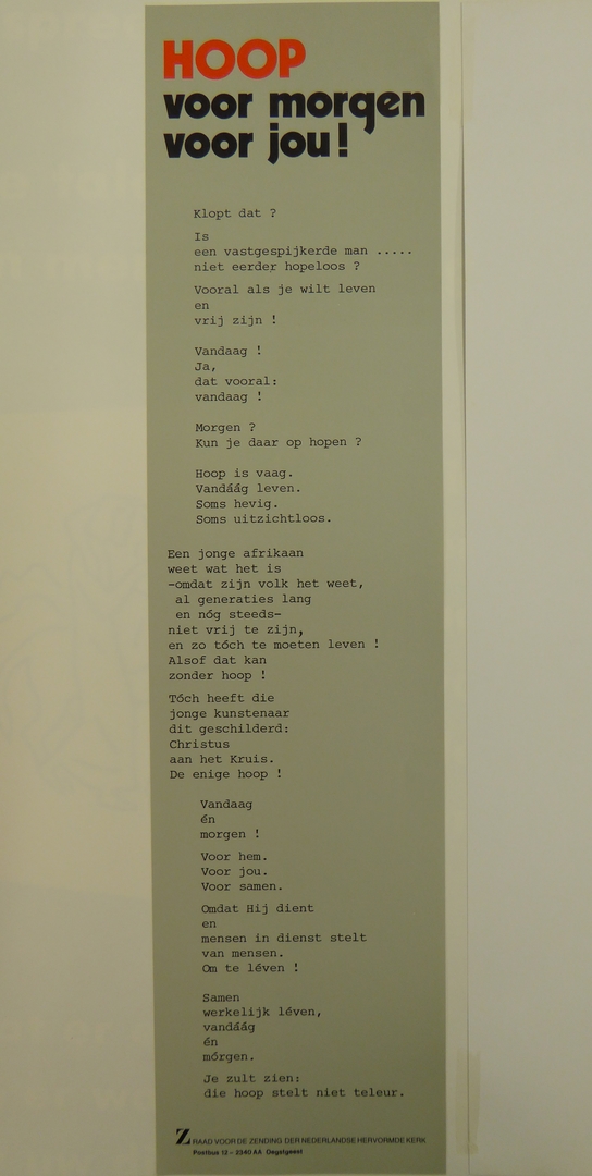 Affiche in twee delen: een strook met tekst, hoop voor morgen, voor jou