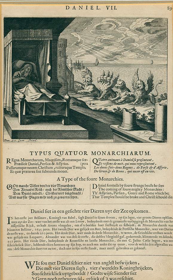 Gravure van Daniel die slaapt in een bed en vier monsterachtige dieren vanuit de zee het land op ziet komen. Op de achtergrond een rustige zee met enkele zeilschepen. Onder de gravure staat de betreffende passage uit het bijbelverhaal in vijf talen (Latijn, Frans, Duits, Engels, Nederlands) en daaronder staat een vierregelig gedichtje over Daniel.