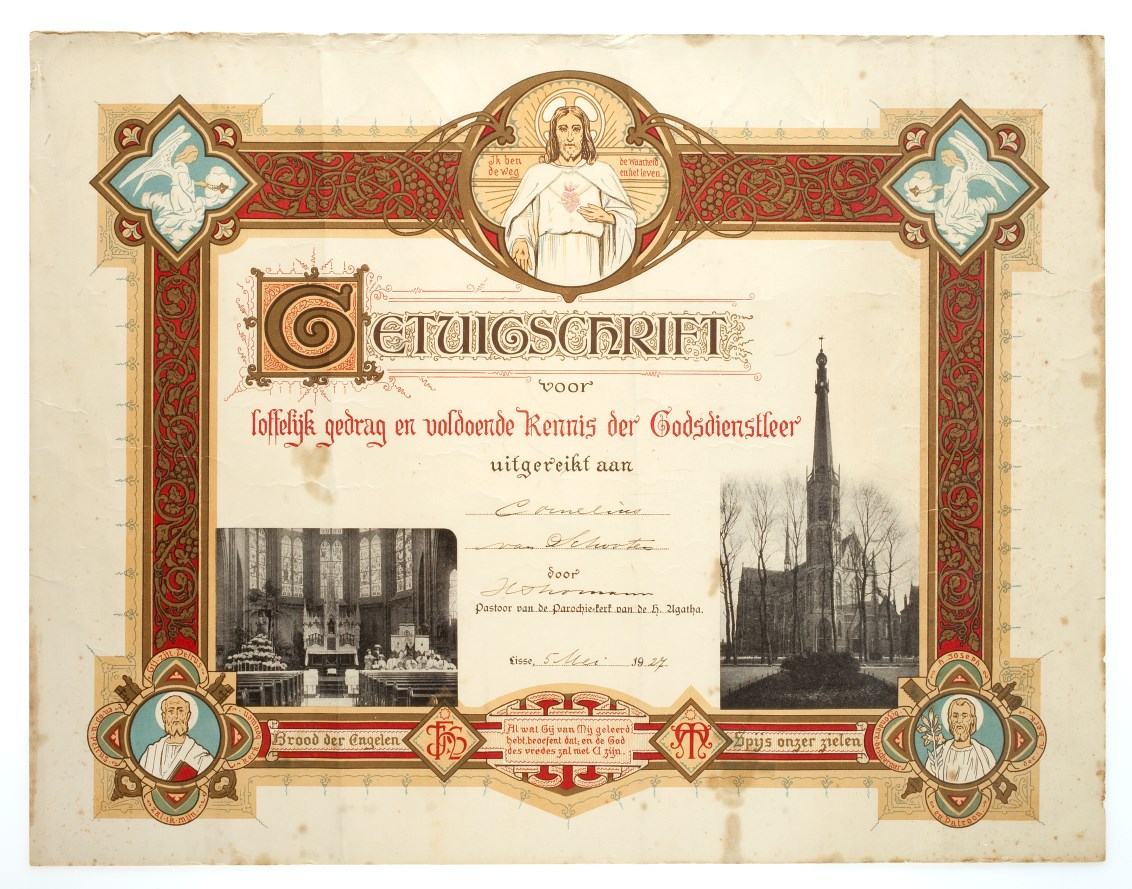 Getuigschrift voor loffelijk gedrag en voldoende kennis der godsdienstleer uitgereikt aan Cornelius van Schooten ... H. Agatha Lisse, 5 mei 1927