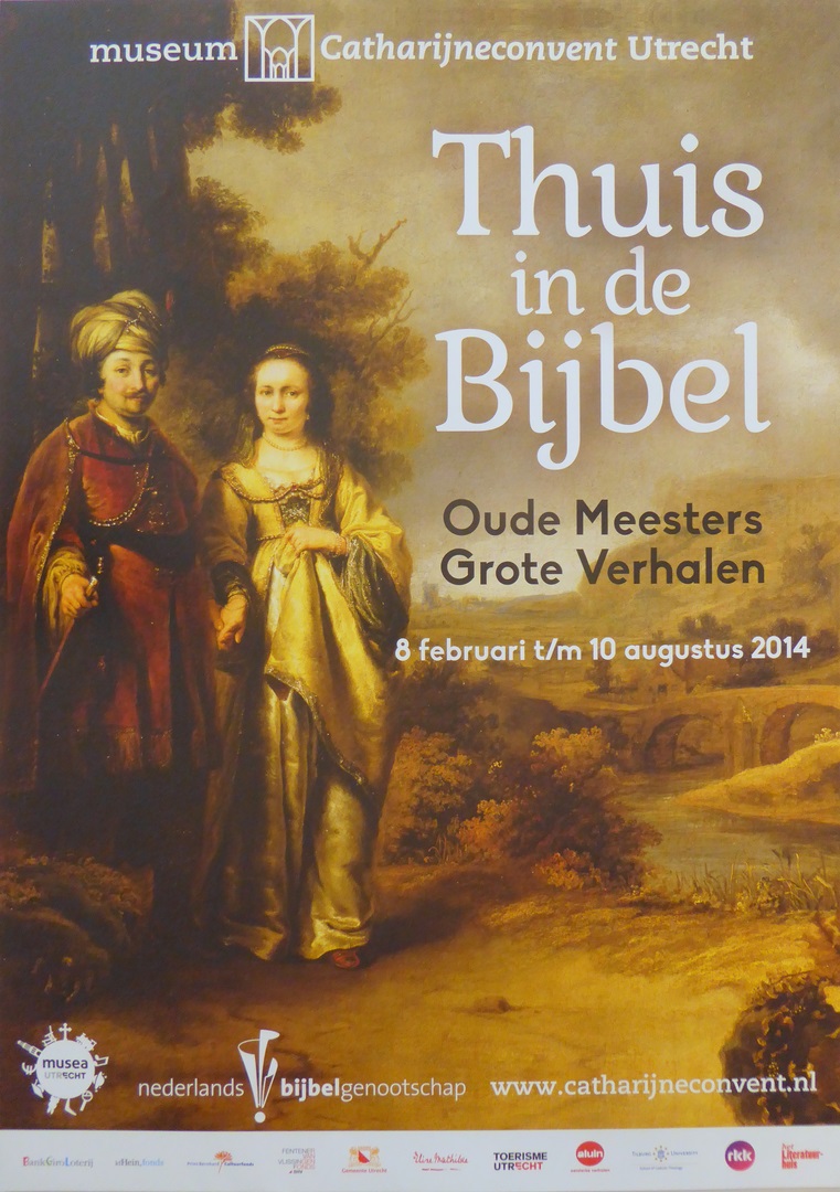 Affiche "Museum Catharijneconvent Utrecht Thuis in de bijbel Oude meesters grote verhalen 8 februari t/m 10 augustus 2014", met man en vrouw in landschap