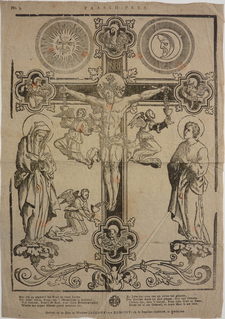 Centsprent met houtsnede van de kruisiging, met links Maria en rechts Johannes de evangelist. Op de uiteinden van het kruis de vier evangelistensymbolen in een vierpas. Engelen vangen bloed uit de voet- en handwonden van Christus op in kelken. Linksboven is de zon weergegeven, rechts de maan. Boven de prent staat 'No. 3' en 'Paasch-prys'. ...