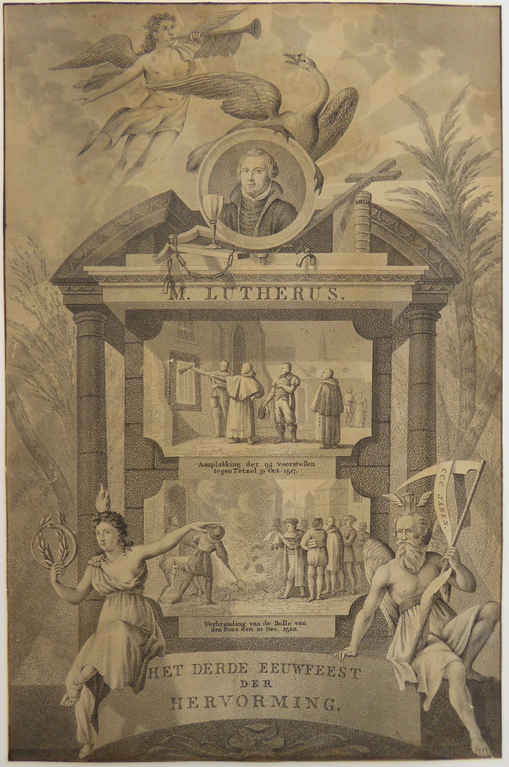 Allegorische prent vervaardigd bij het derde eeuwfeest van de Hervorming. Classicistisch prieel met een door zuilen gedragen fronton, geflankeerd door palmbomen. In de open ruimte van het doorbroken fronton een medaillon met een borstbeeld van Maarten Luther. Het wordt vastgehouden door een zwaan met opgeven vleugels, die omziet naar een van links aanvliegende, bazuinblazende engel. ...