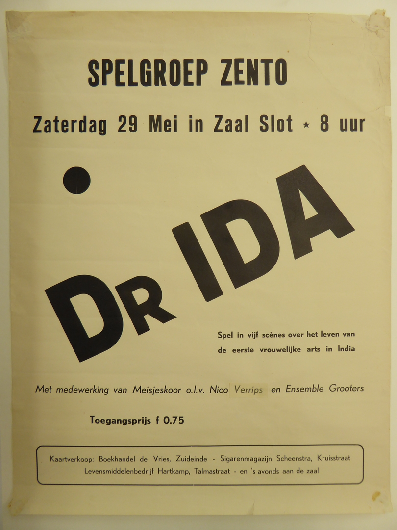 Affiche spelgroep Zento, toneelstuk "Dr. Ida, eerste vrouwelijke arts in India"