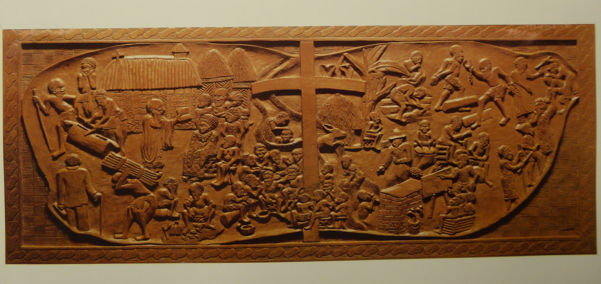 Affiche kleurenfoto houtsnijwerk met enkele zendingstafereeltjes