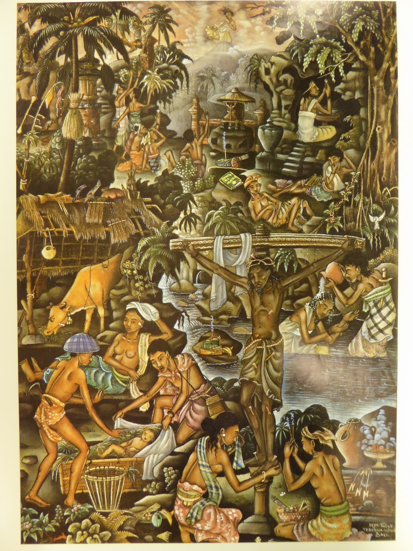 Affiche geschilderde afbeelding van het leven van Jezus, gesitueerd op Bali