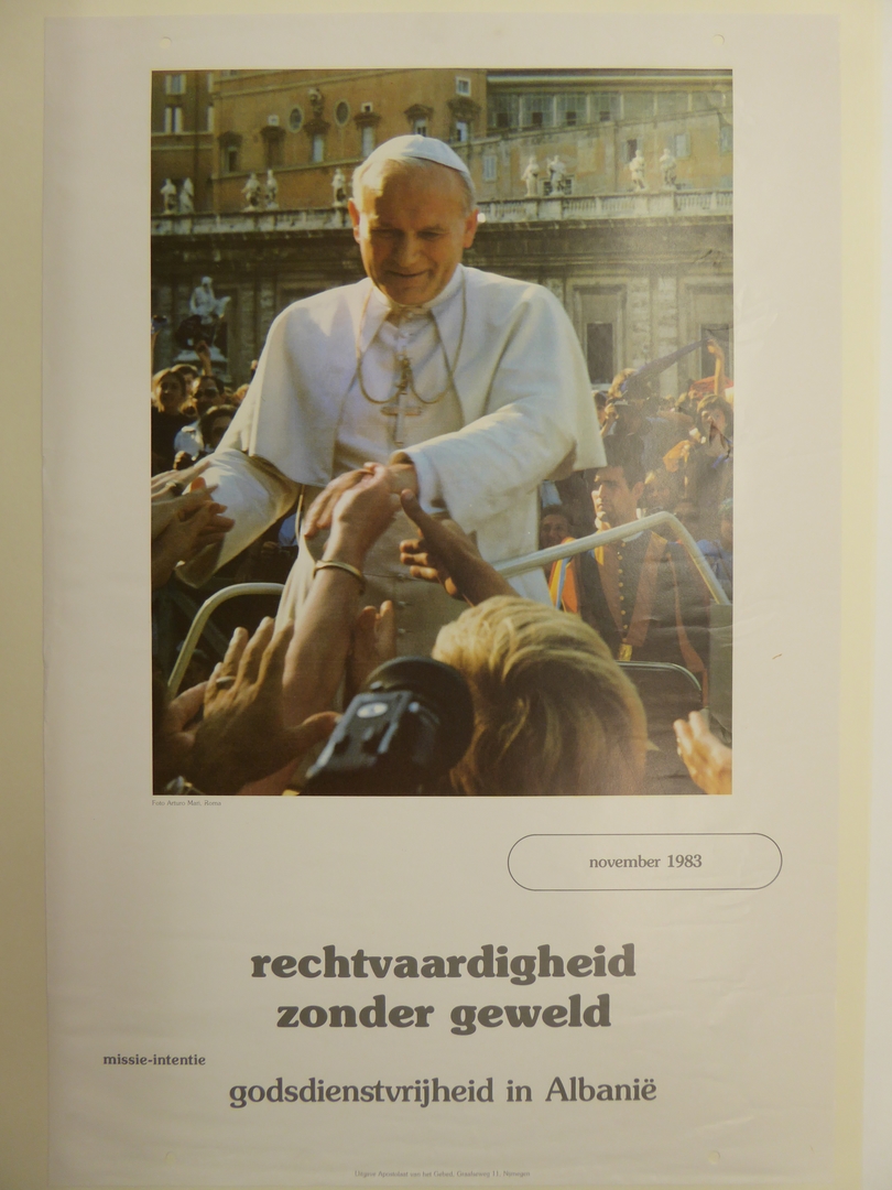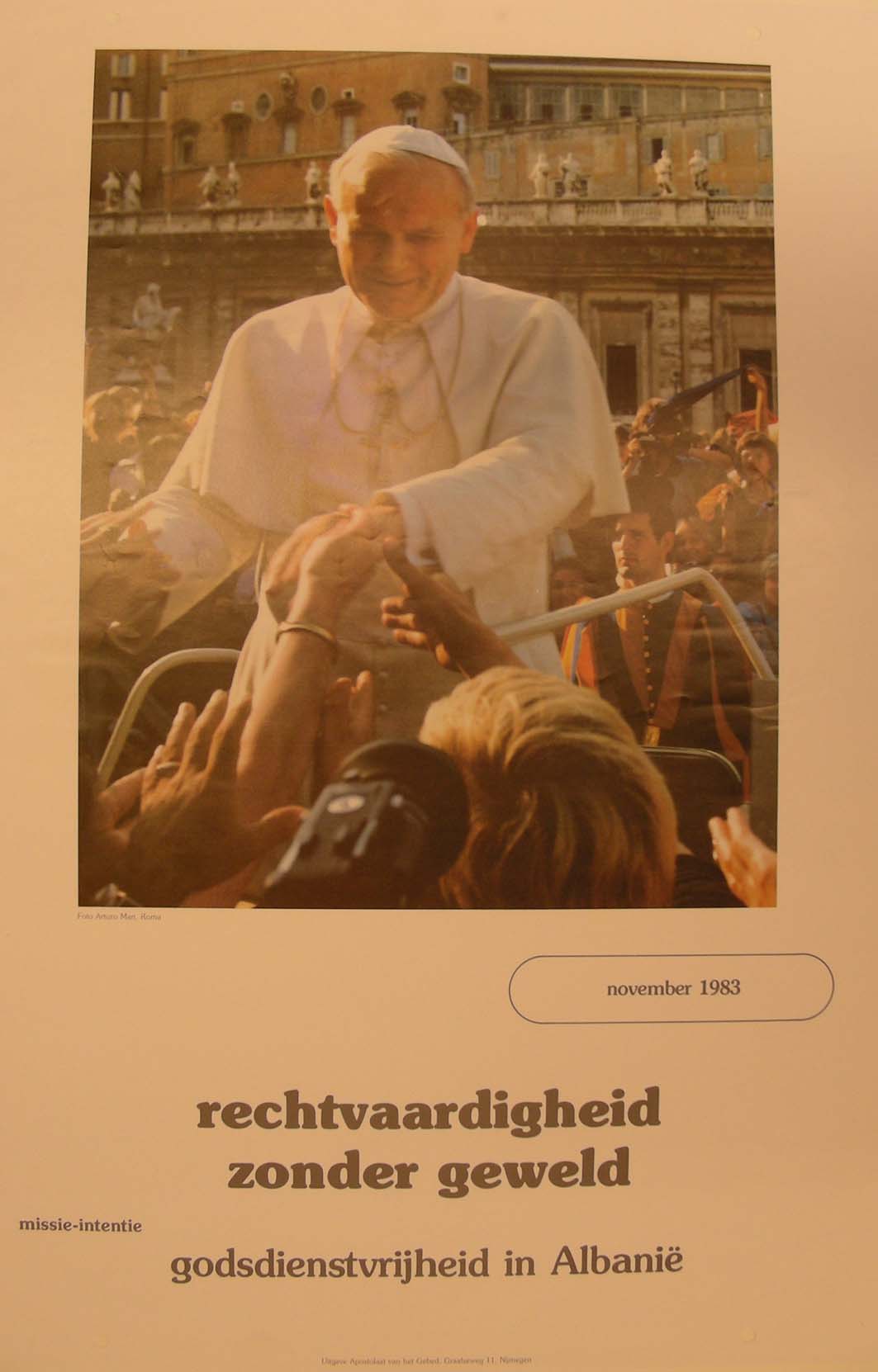 Affiche met Johannes Paulus II met "Godsdienstvrijheid in Albanië"