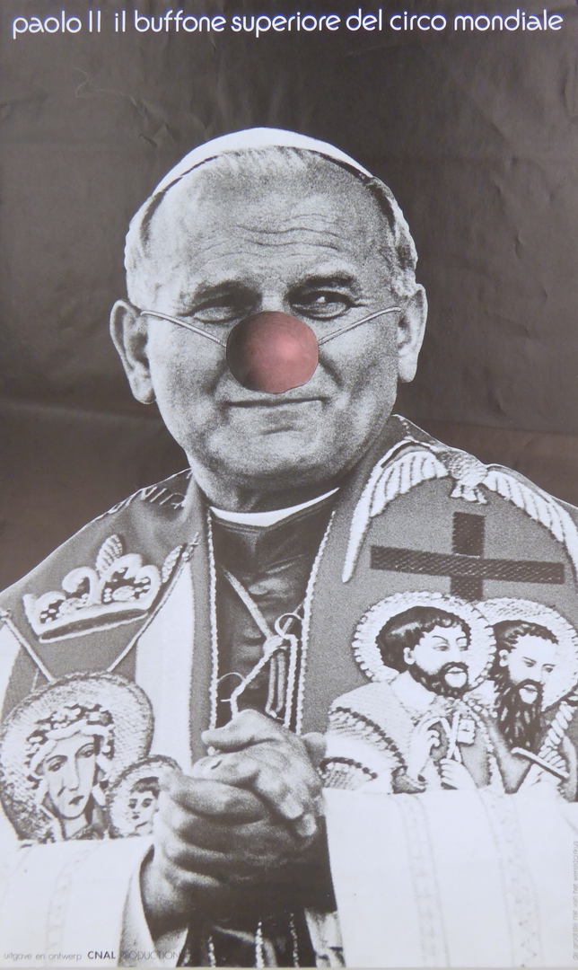 Affiche paus Johannes Paulus met stola, als 'de grootste nar van het wereldcircus'