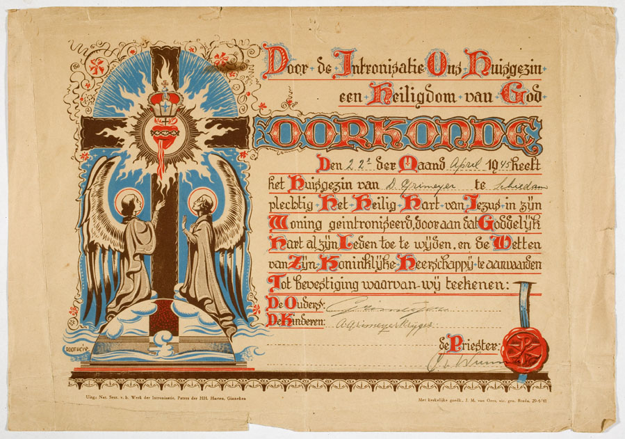 Oorkonde: "Door de intronisatie ons huisgezin een heiligdom van God ... D. Grimeyer te Schiedam ..."