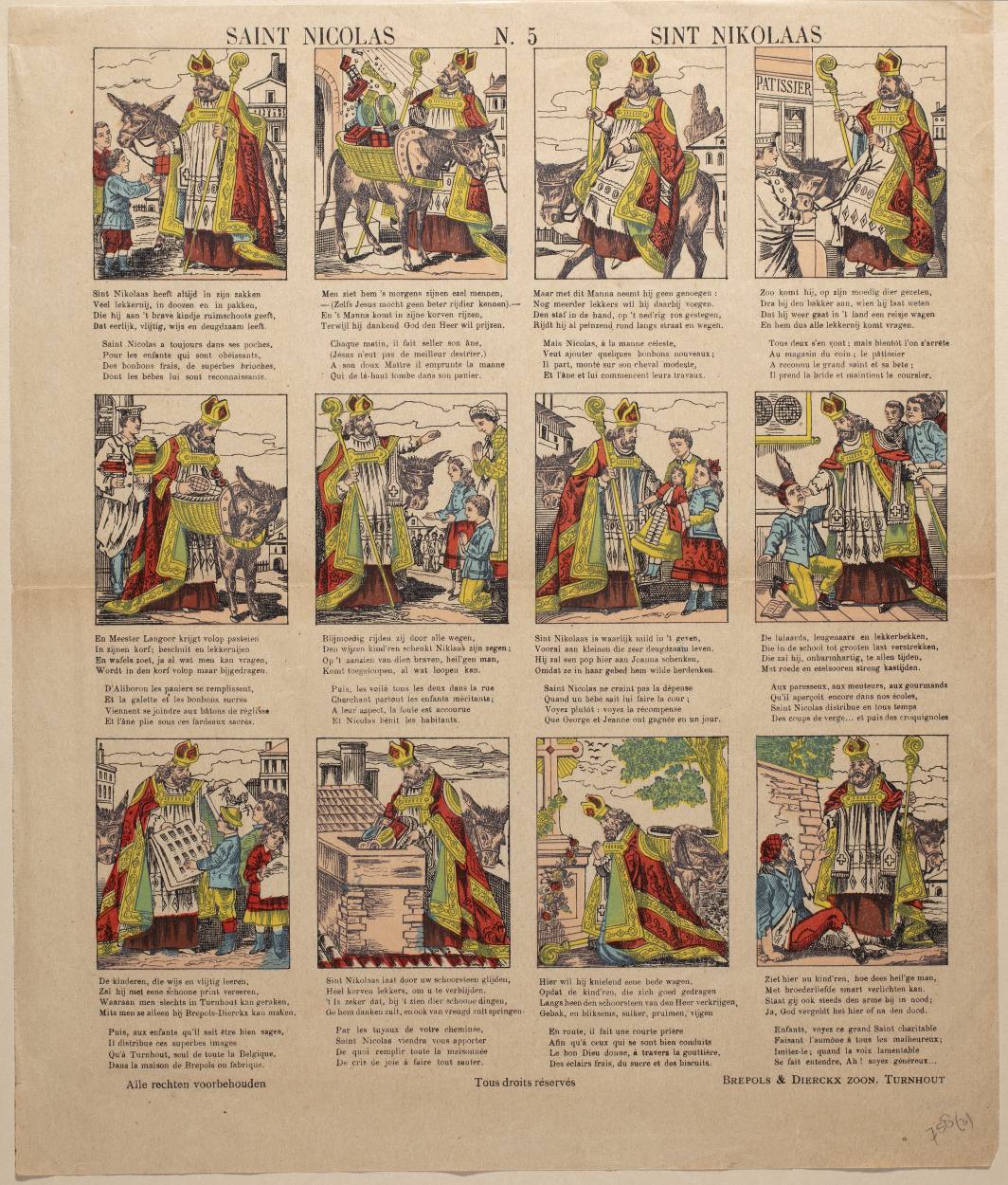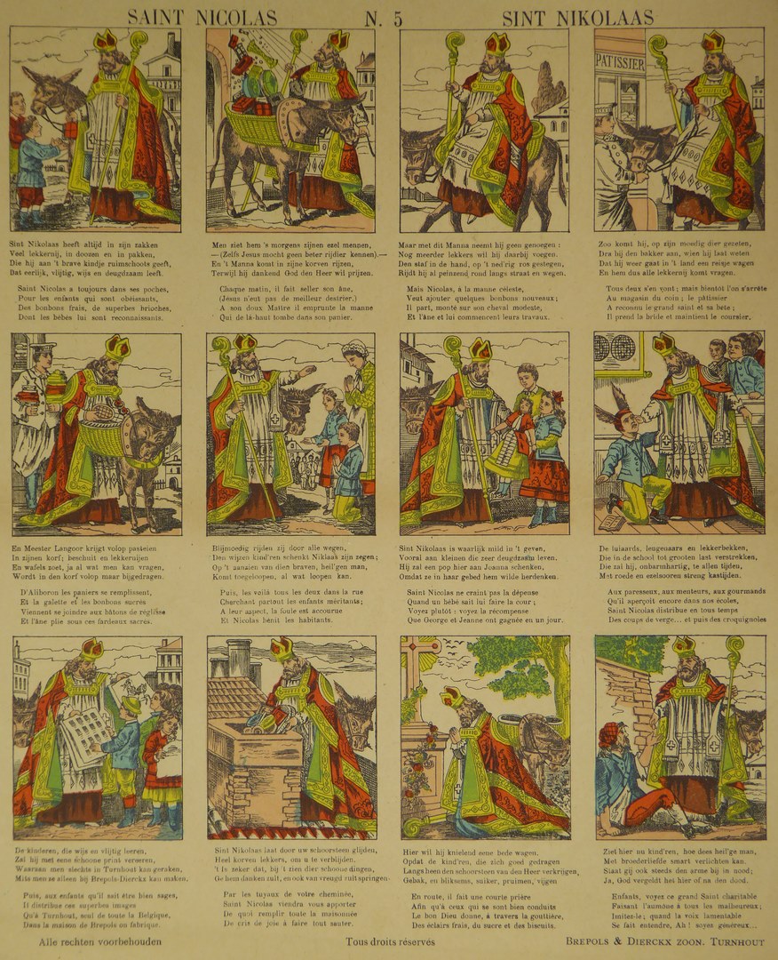 Kinderprent "Saint Nicolas" Sint Nicolaas, twaalf afbeeldingen ingekleurd