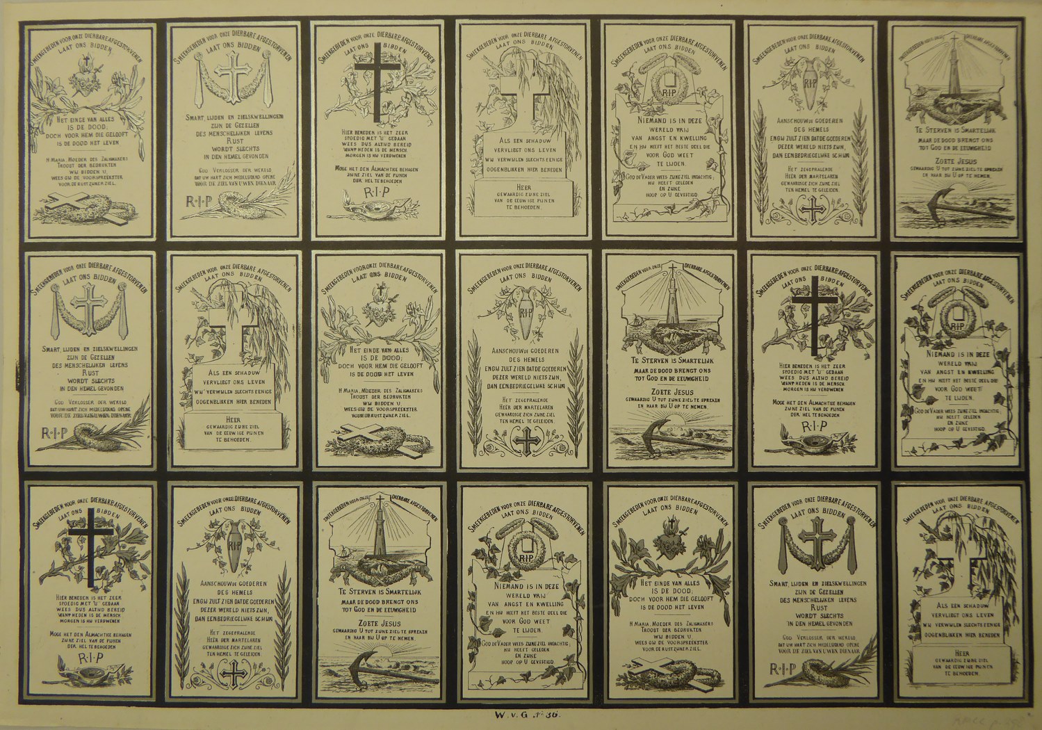 Vel met eenentwintig bidprentjes, gedecoreerd met rouwsymbolen