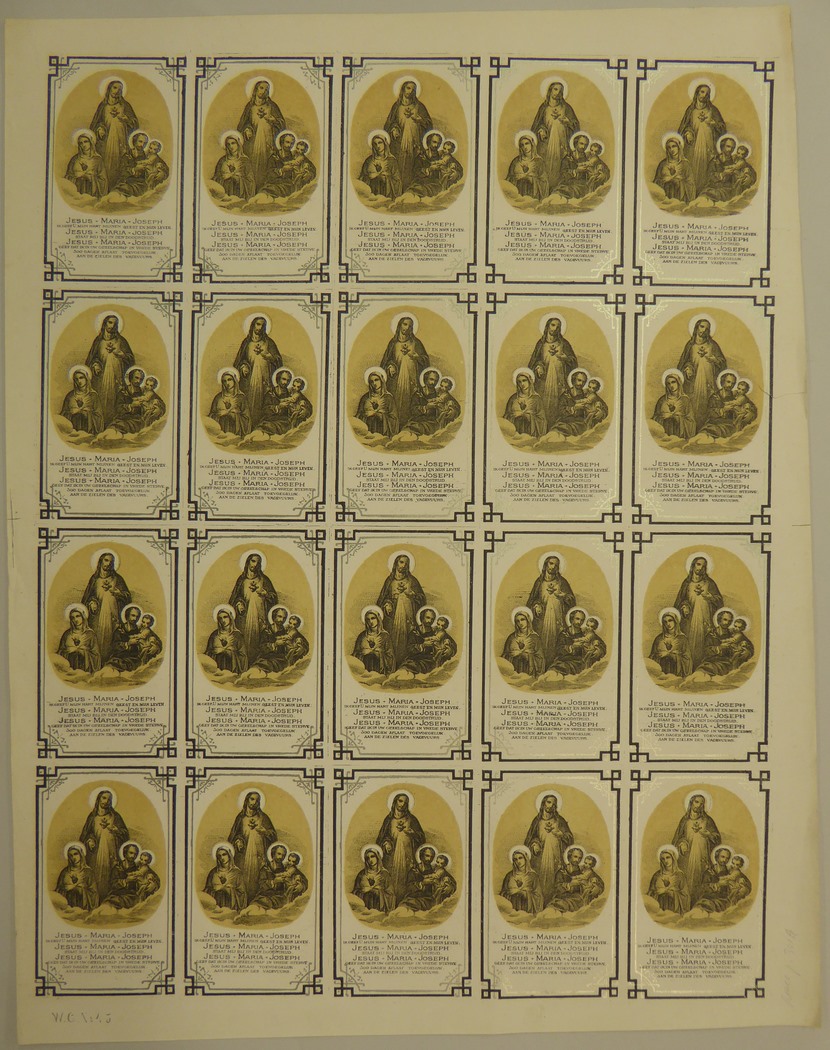 Vel met twintig identieke bidprentjes met Maria, Jezus en Jozef