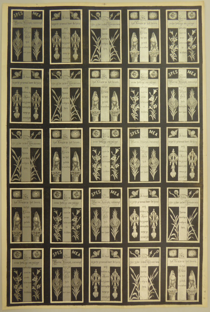 Vel met vijfentwintig bidprentjes zwart met zilverkleurige kleuren, rouwsymboliek, putti, enz.