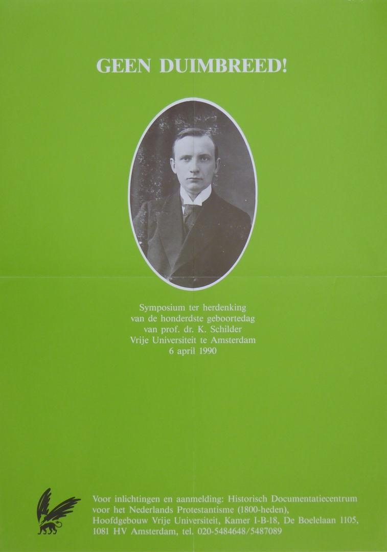Affiche "Geen duimbreed, symposium ter herdenking van de honderdste geboortedag van prof. dr. K. Schilder, Vrije Universiteit te Amsterdam 6 april 1990 ..."