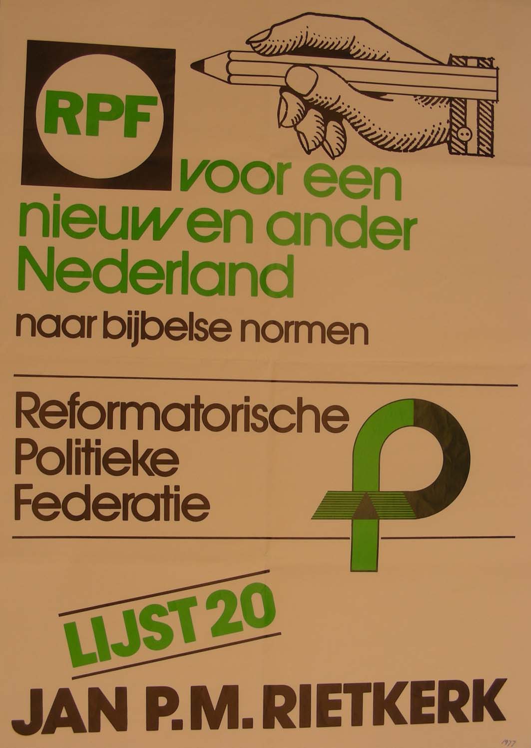 Affiche "RPF voor een nieuw en ander Nederland naar bijbelse normen, Reformatorische Politieke Federatie, lijst 20 Jan P.M. Rietkerk"