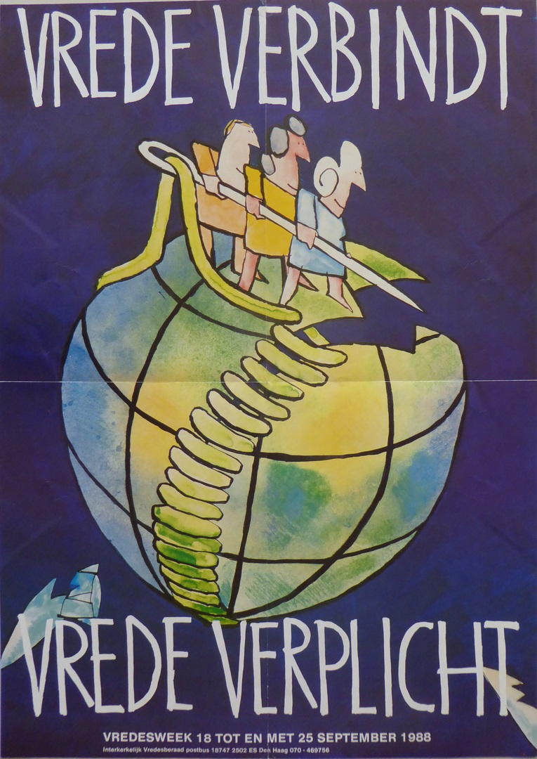 Affiche "Vrede verbindt vrede verplicht vredesweek 18 tot en met 25 september 1988" met wereldbol in twee stukken, die aaneengenaaid wordt