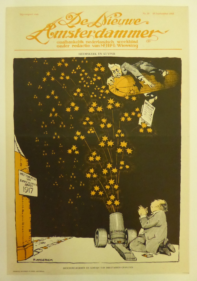 Geknielde Abraham Kuyper naast een kanon die Heemskerk onder vuur neemt