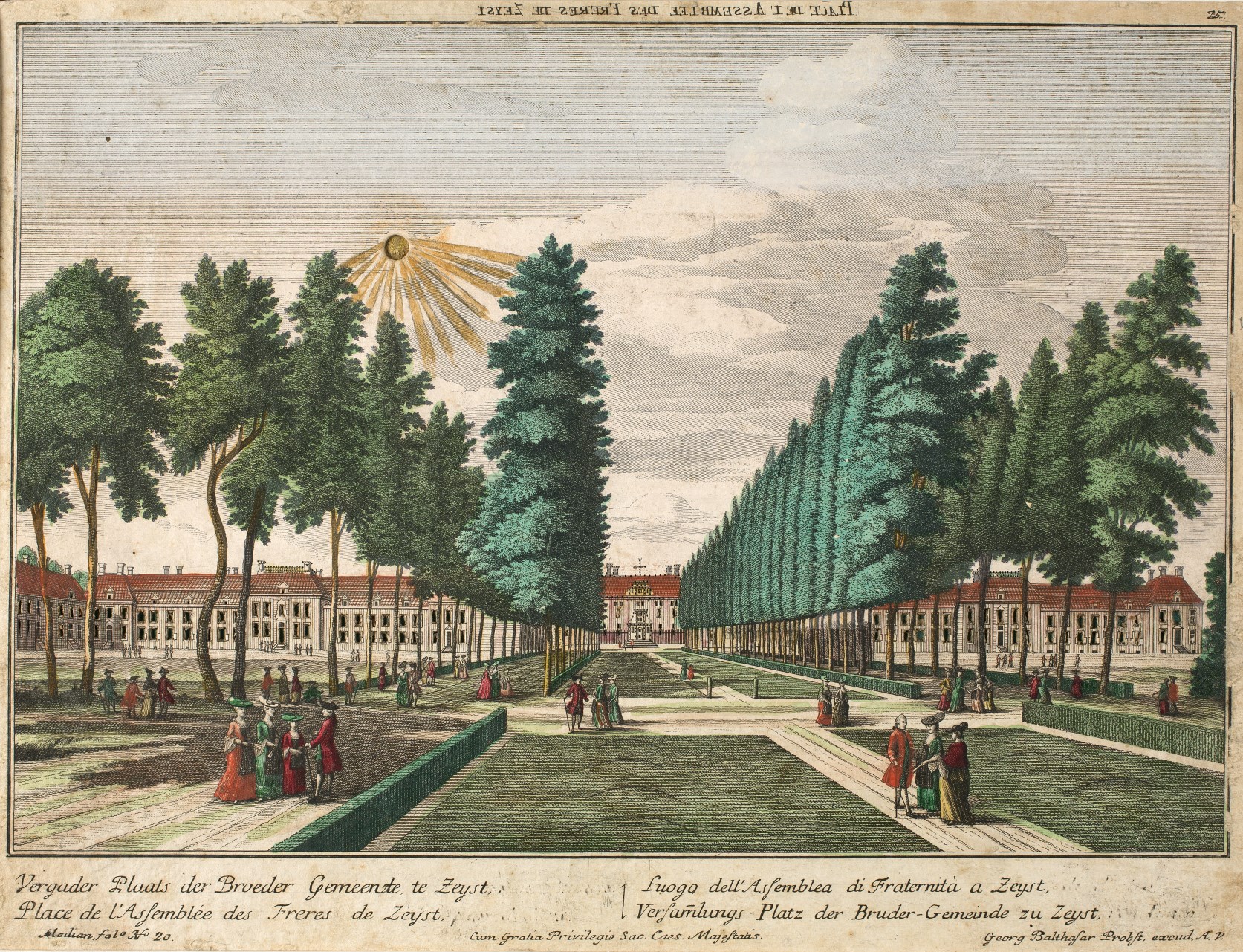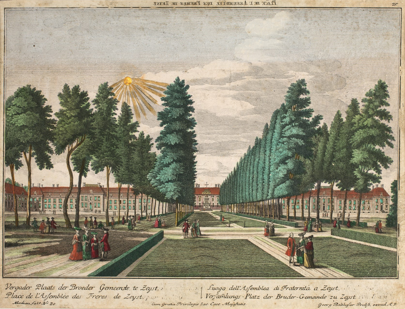 Zeist, panopticaprent van de gebouwen van de Hernhutters te Zeist, ingekleurd