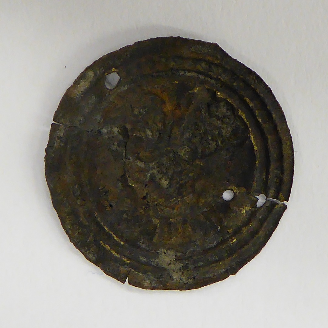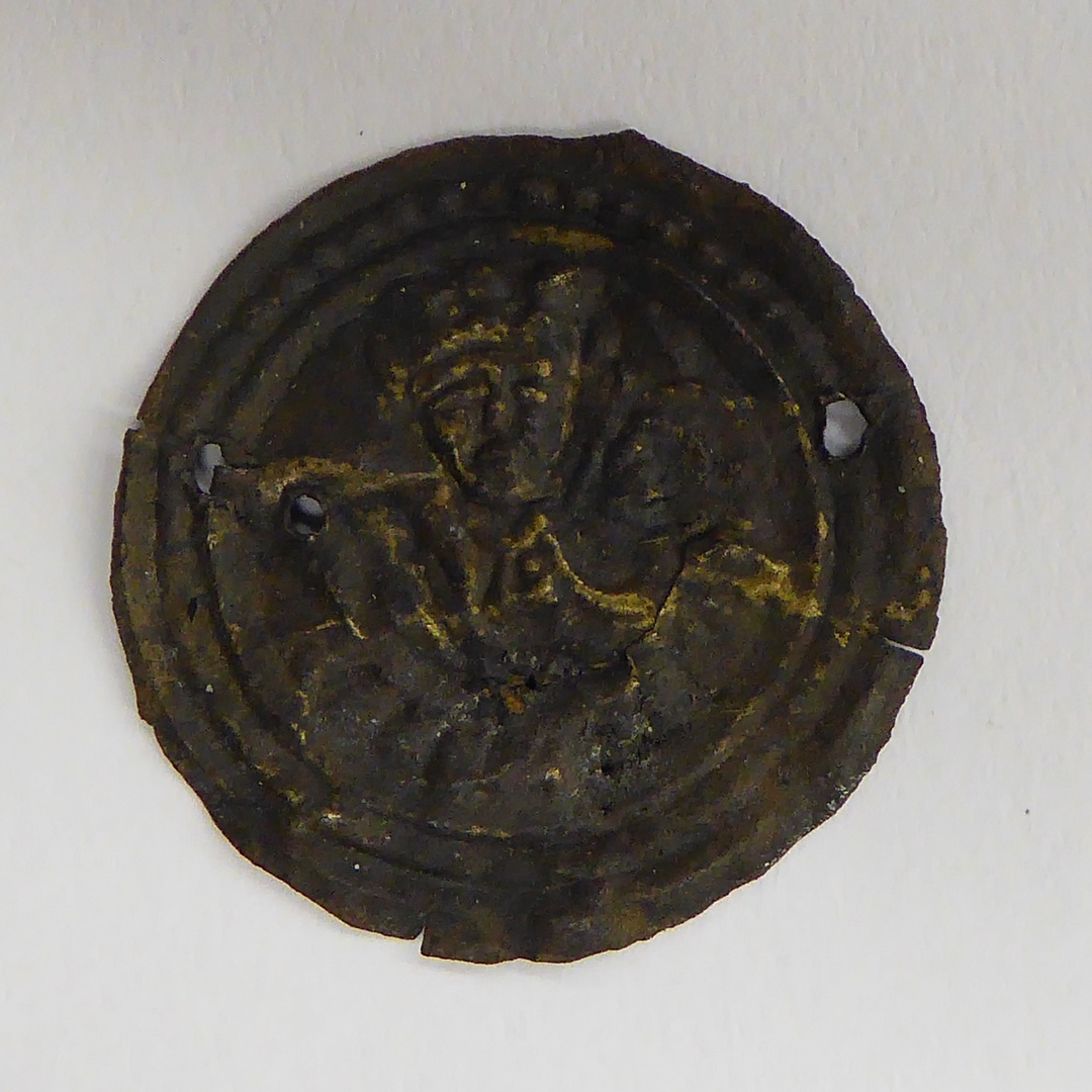 Pelgrimsinsigne, rond, met een koningsfiguur ten halve lijve