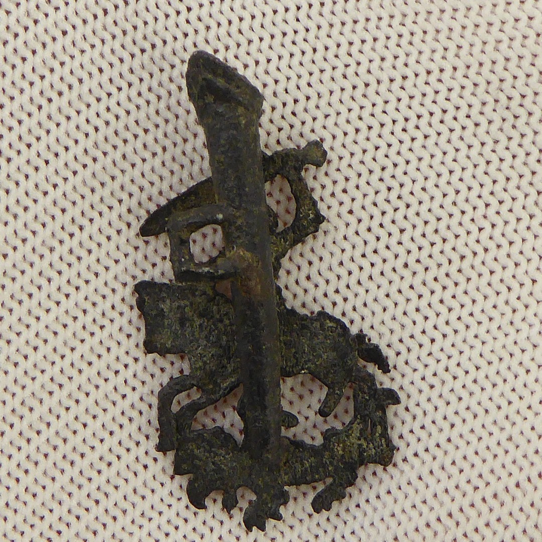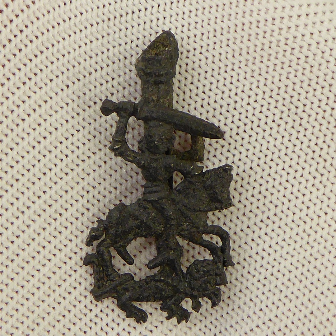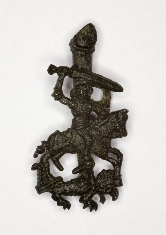 Pelgrimsteken, St. Joris te paard met groot zwaard, met verenkoker