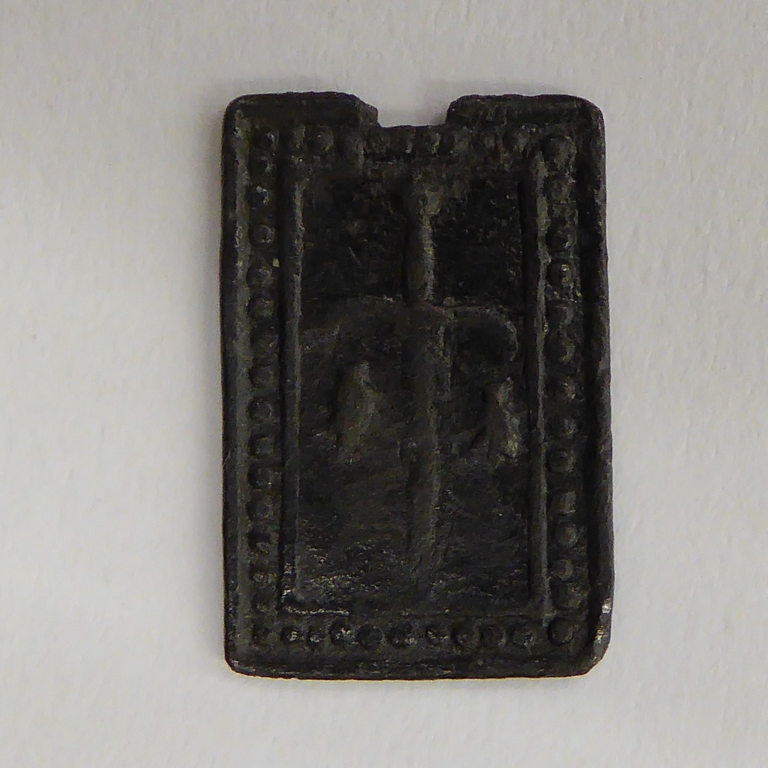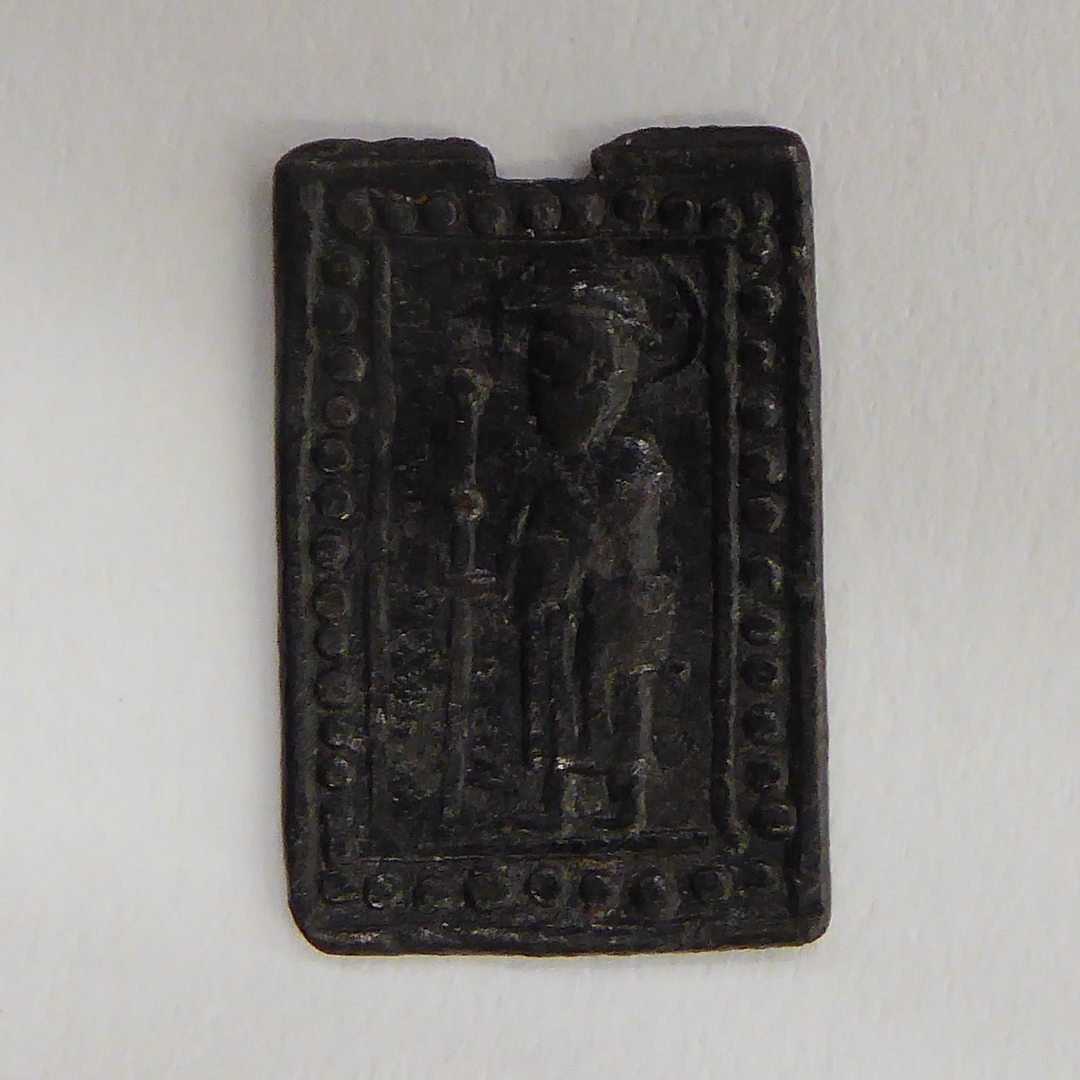 Rechthoekig gesloten pelgrimsteken, H. pelgrim met aureool, staf in rechterhand, kz. zwaard