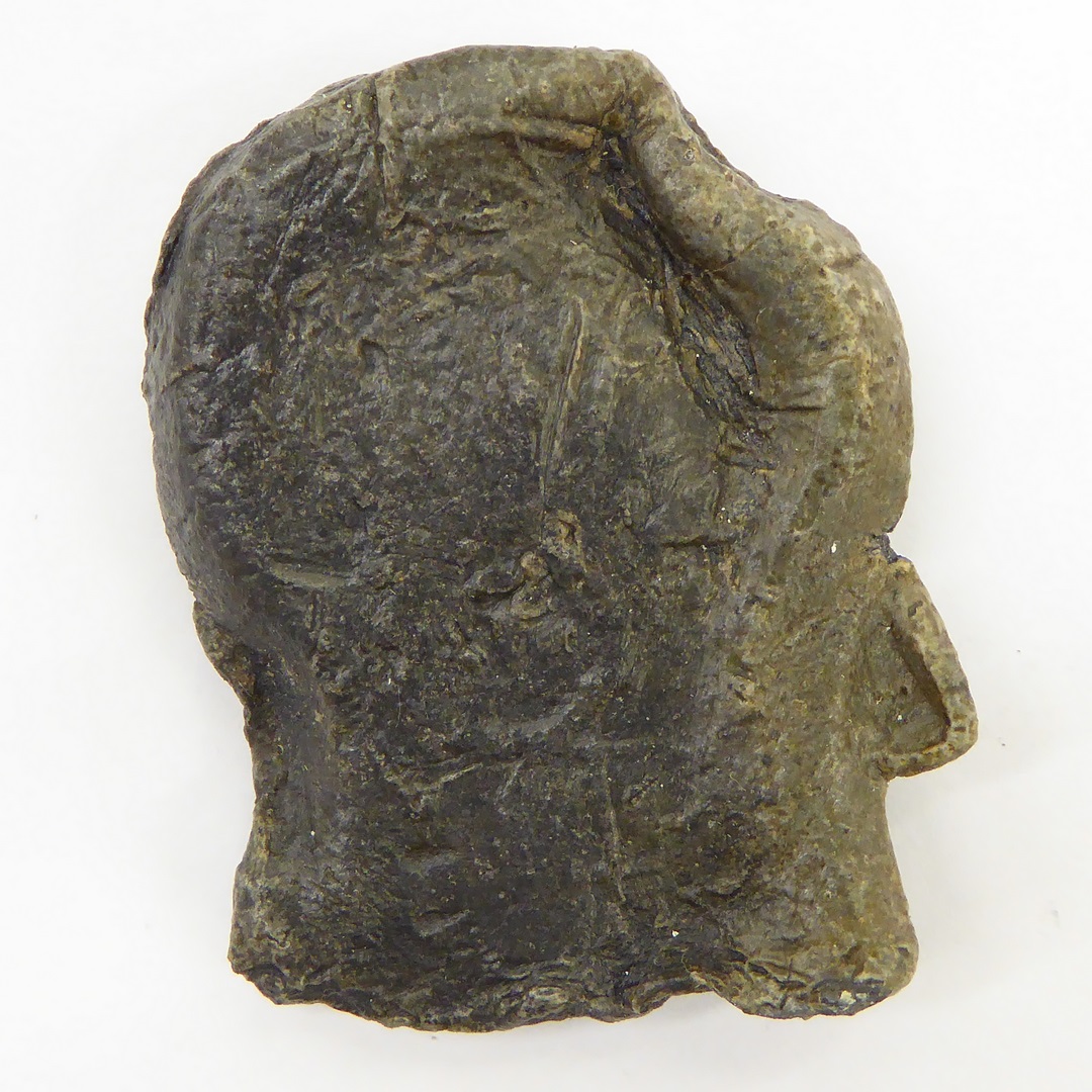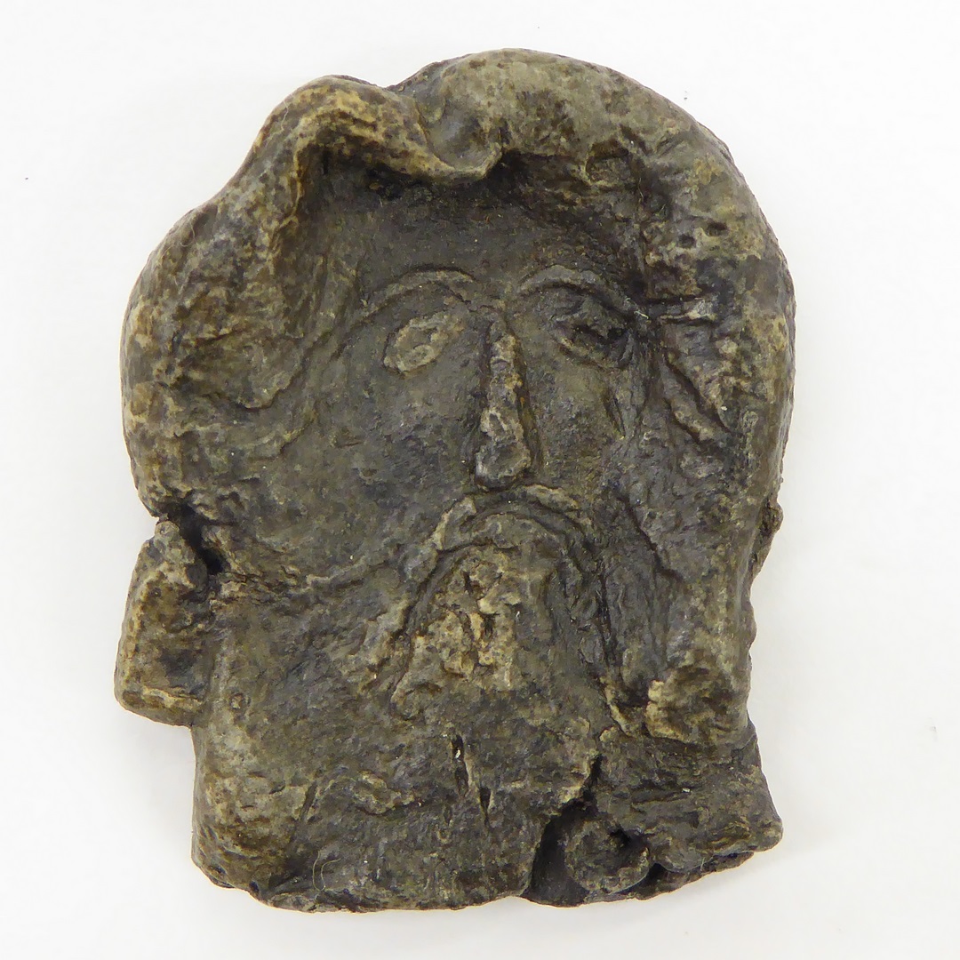 Pelgrimssouvenir in vorm van een ampul, waarop gezicht met baard in reliëf