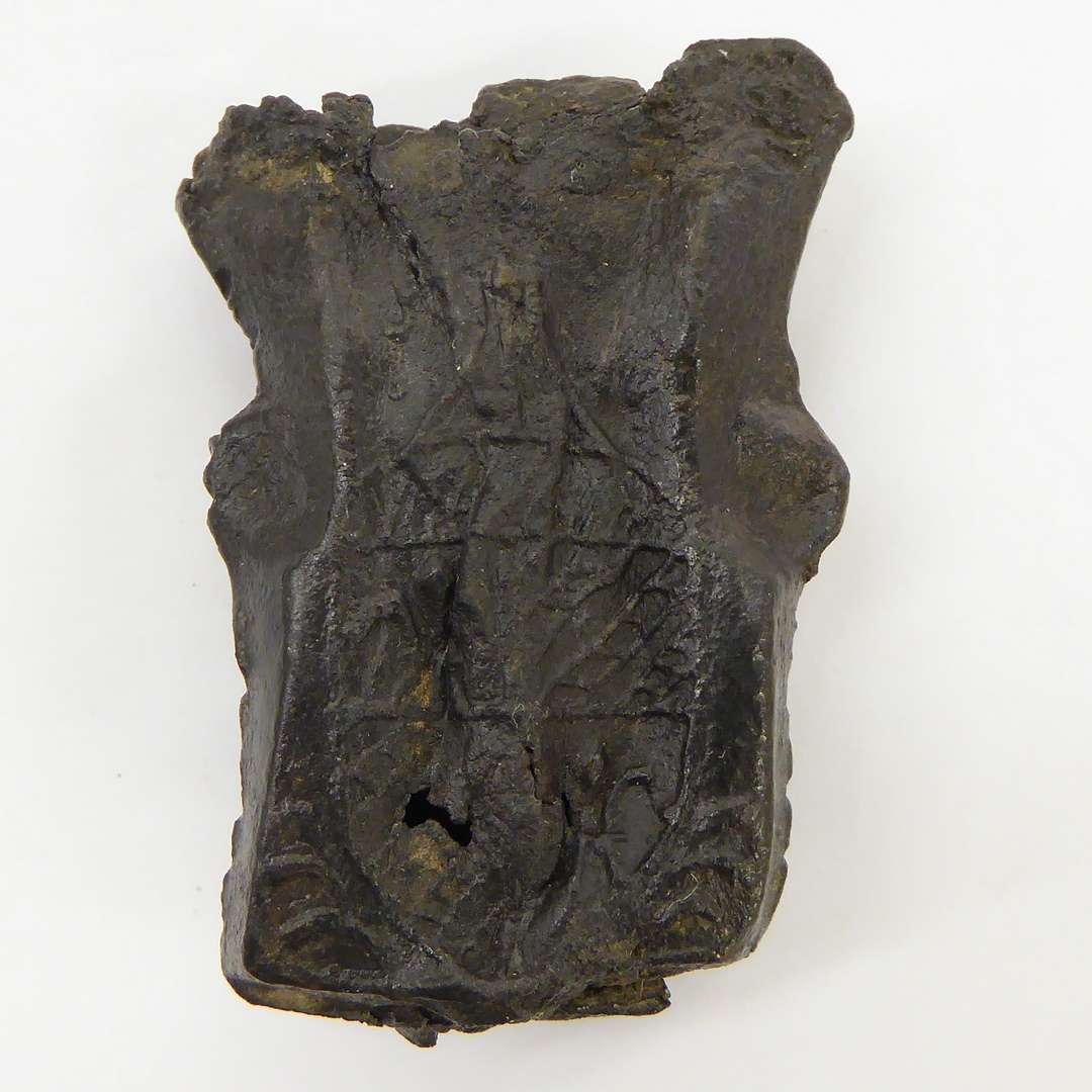 Pelgrimssouvenir in vorm van een ampul, voorop wapenschild met drie Franse lelies