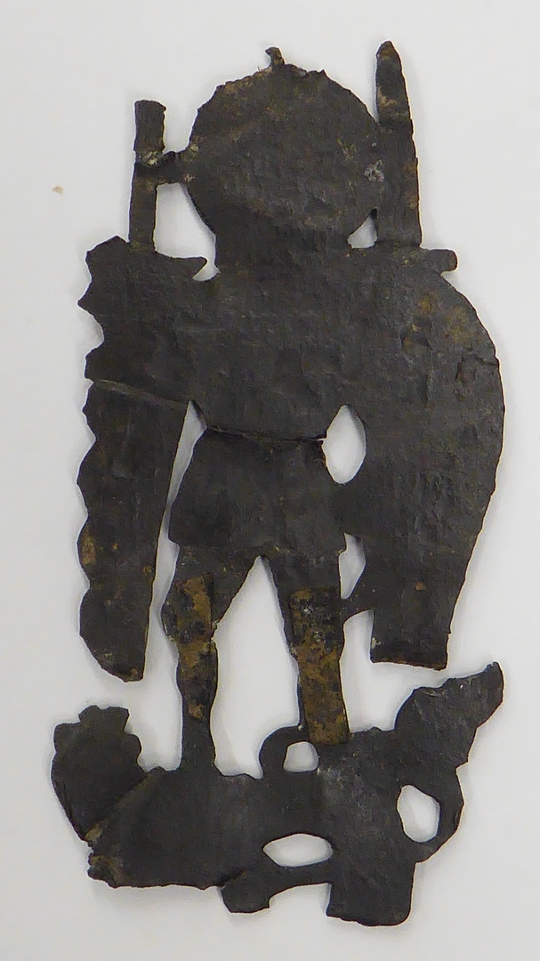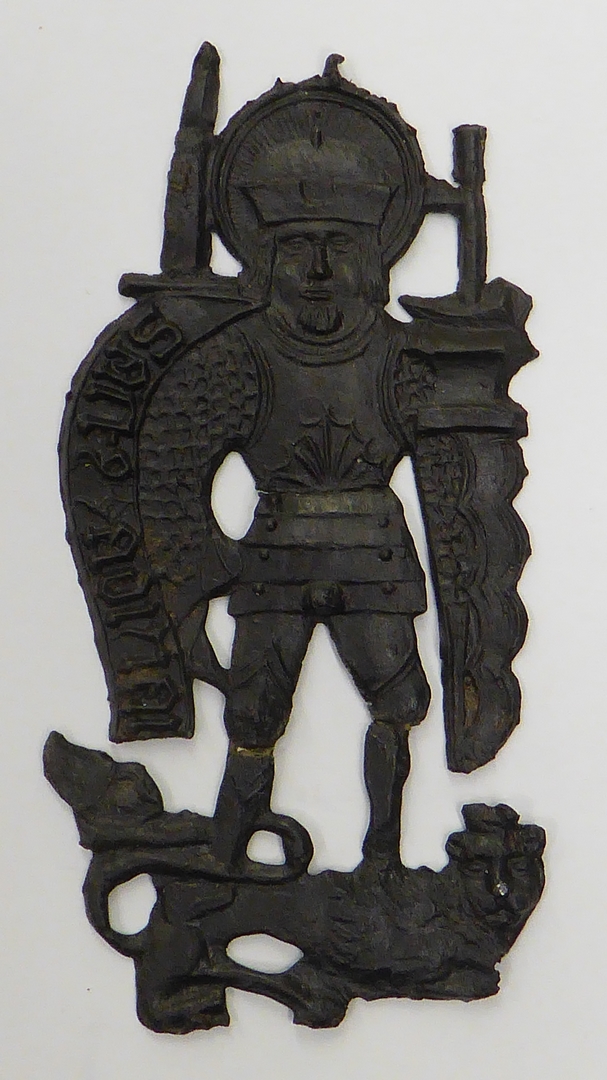 Pelgrimsteken, geharnaste St. Adrianus, in rechterhand zwaard, in linkerhand hamer en aambeeld