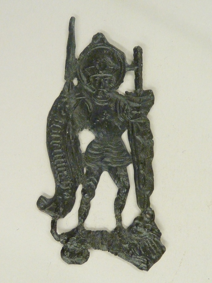 Pelgrimsteken, geharnaste Adrianus, in rechterhand zwaard, in linkerhand hamer en aambeeld