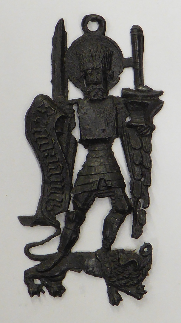 Pelgrimsteken, geharnaste Adrianus, in rechterhand zwaard, in linkerhand hamer en aambeeld