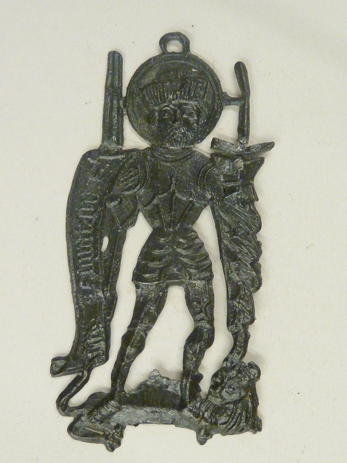 Pelgrimsteken, geharnaste Adrianus, in rechterhand zwaard, in linkerhand hamer en aambeeld