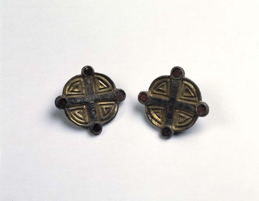 Fibula met kruis op ronde vergulde ondergrond, uiteinden ingelegd met almandien, Frankisch