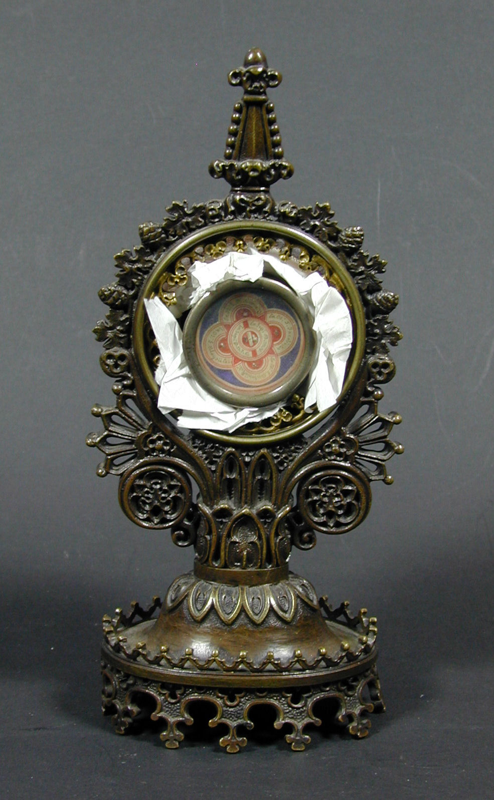 Reliekhouder gemaakt van omgebouwde horlogehouder, met zes reliekjes
