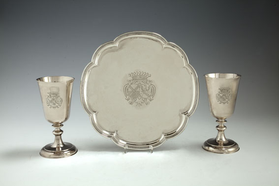 Avondmaalsbeker op voet met wapen van familie De Laet uit voormalige Franse kerk te Voorburg