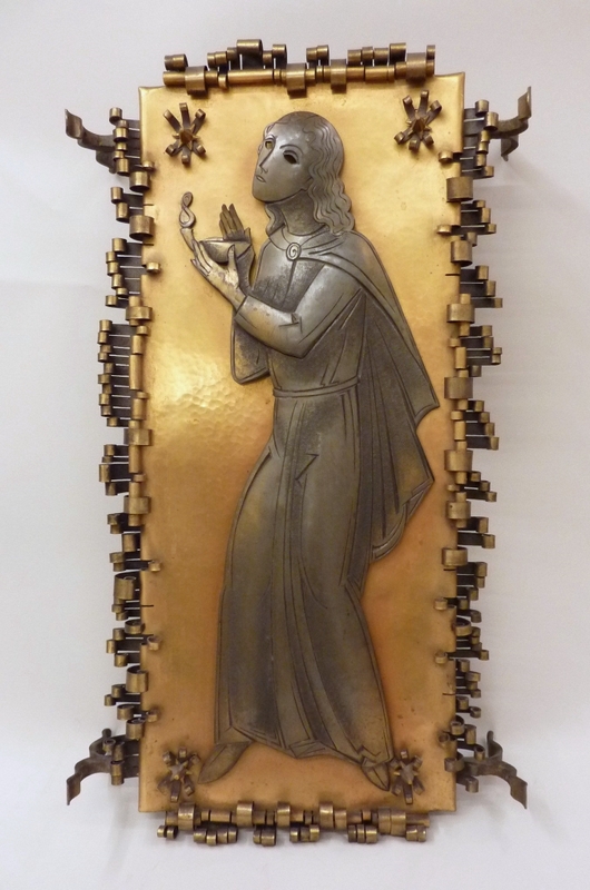 Zevende van tien reliëfs uit een communiebank, voorstellende de wijze en de dwaze maagden: wijze maagd met brandende olielamp in beide handen