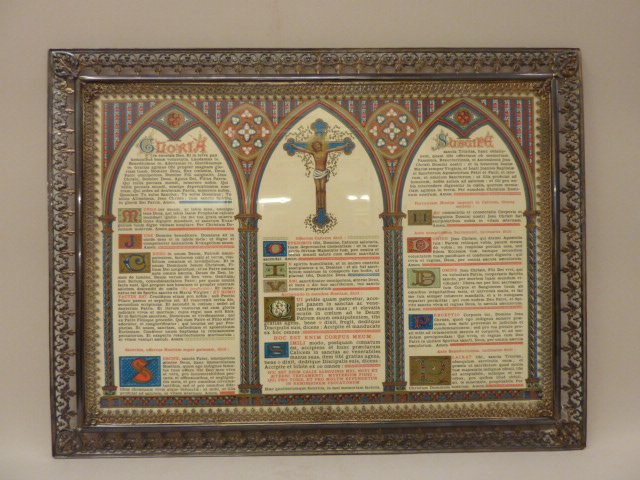 Canonbord, gedrukte tekst in neogotische stijl, gevat in een ornamentiek verzilverd lijstje