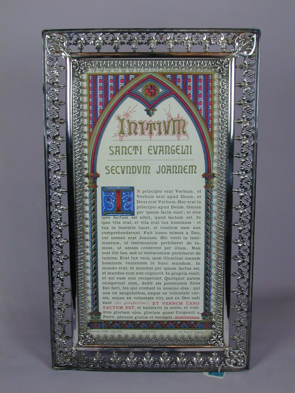 Canonbord, gedrukte tekst in neogotische stijl, gevat in een ornamentiek verzilverd lijstje