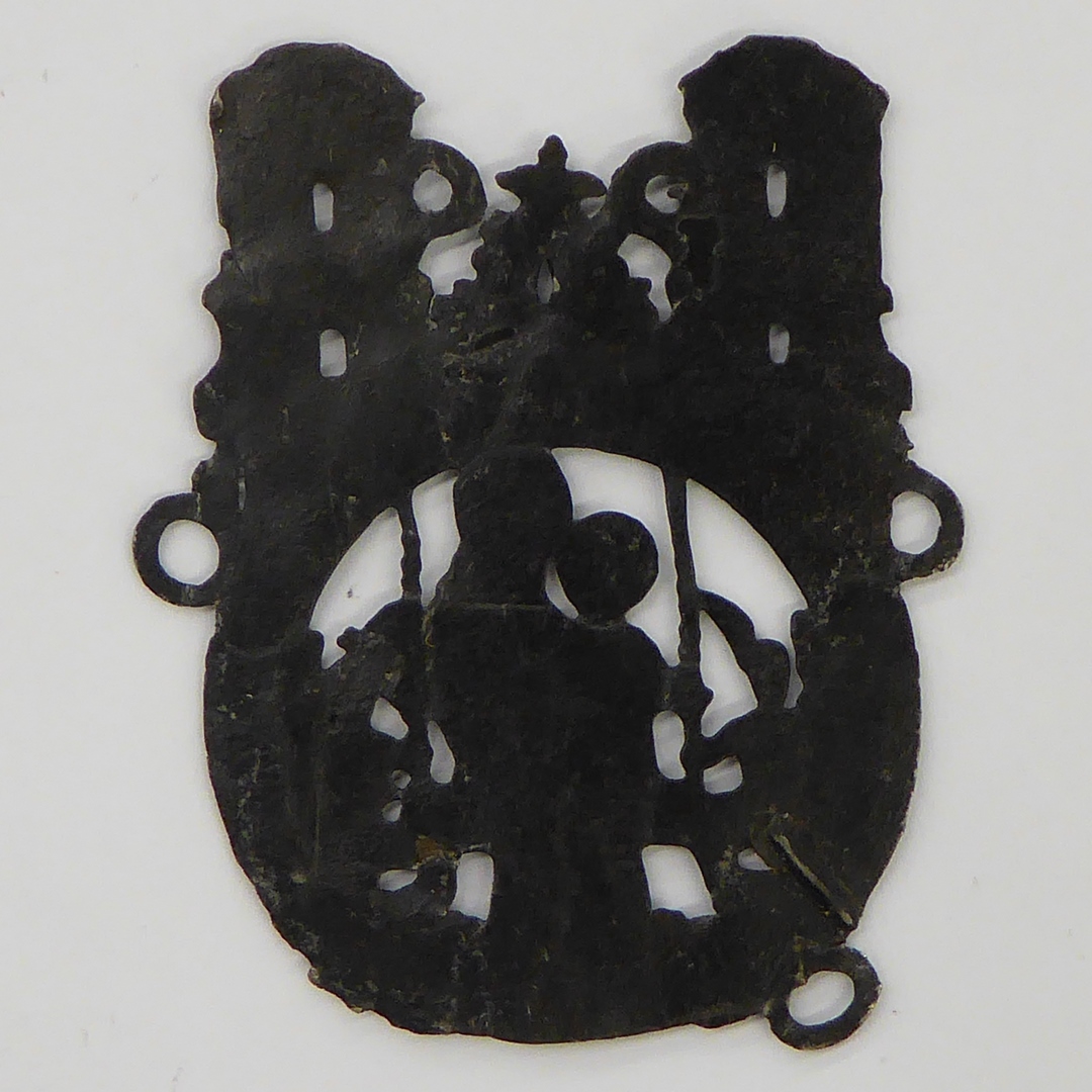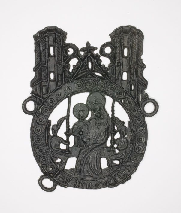 Pelgrimsinsigne O.L.V. Aardenburg, met Maria met kind, geknielde engelen, met "AR.DEN.BUERCH"