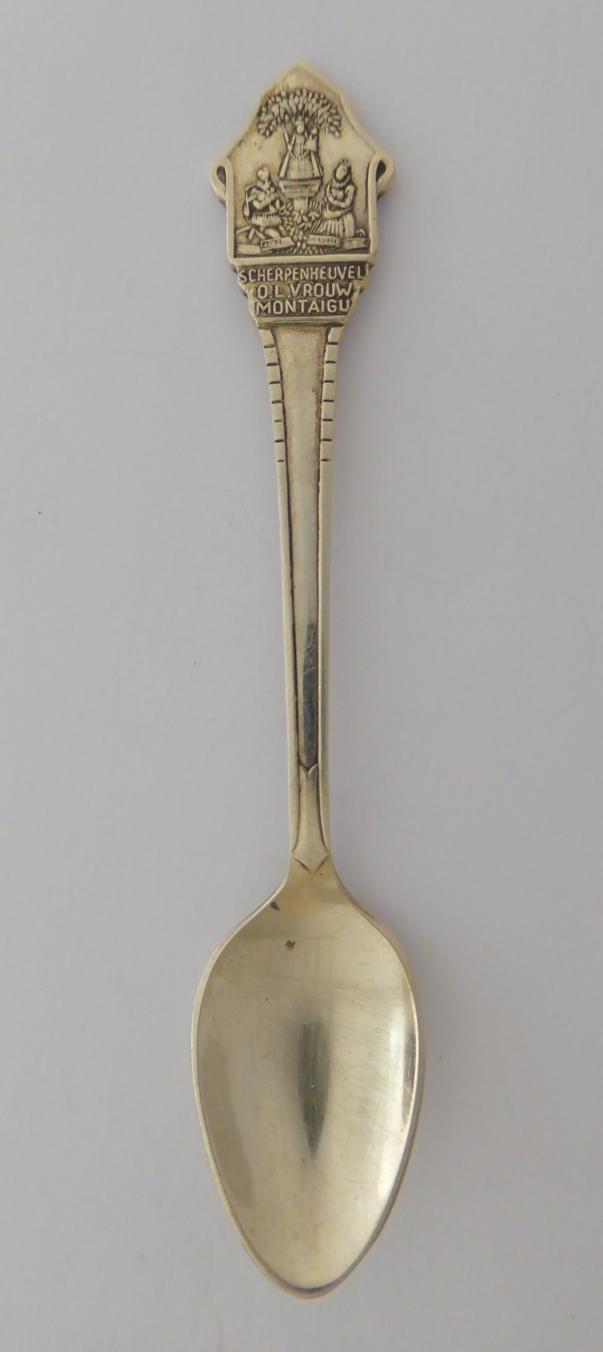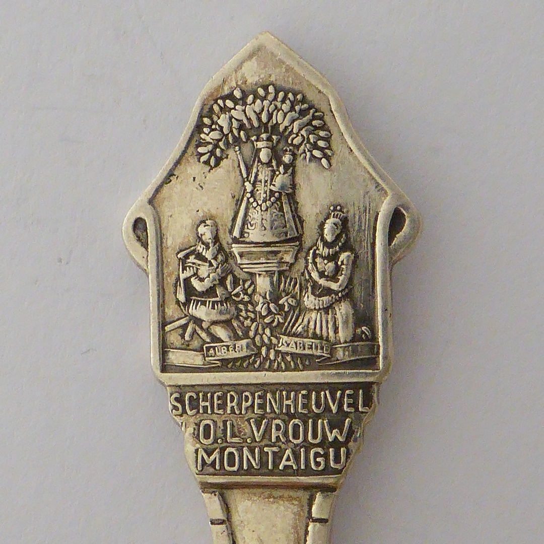 Theelepel met "Scherpenheuvel O.L.Vrouw Montaigu" "Albert" "Isabelle", met Maria, man en vrouw