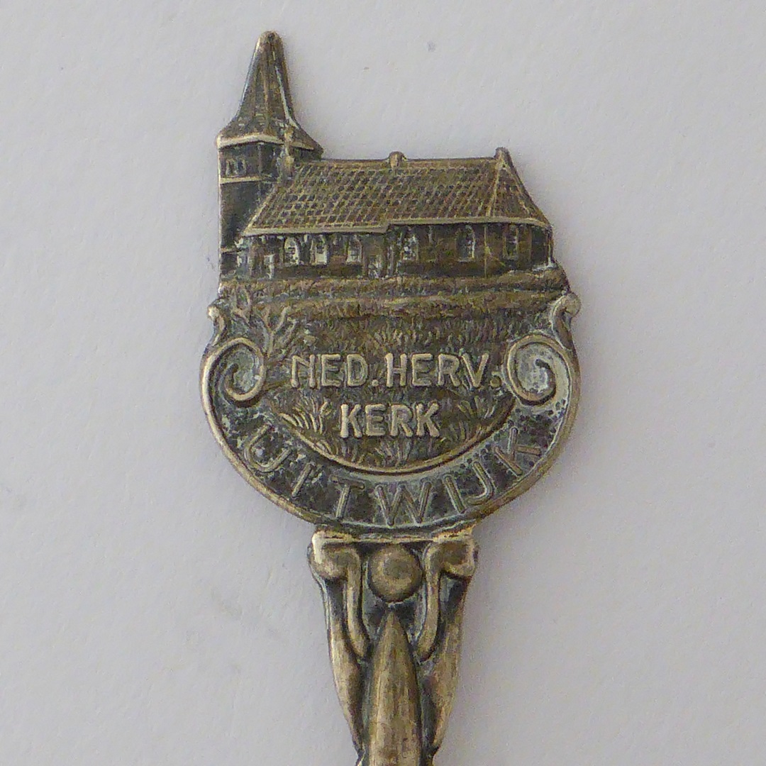 Theelepel met "Uitwijk Ned. Herv. kerk" met kerkgebouw