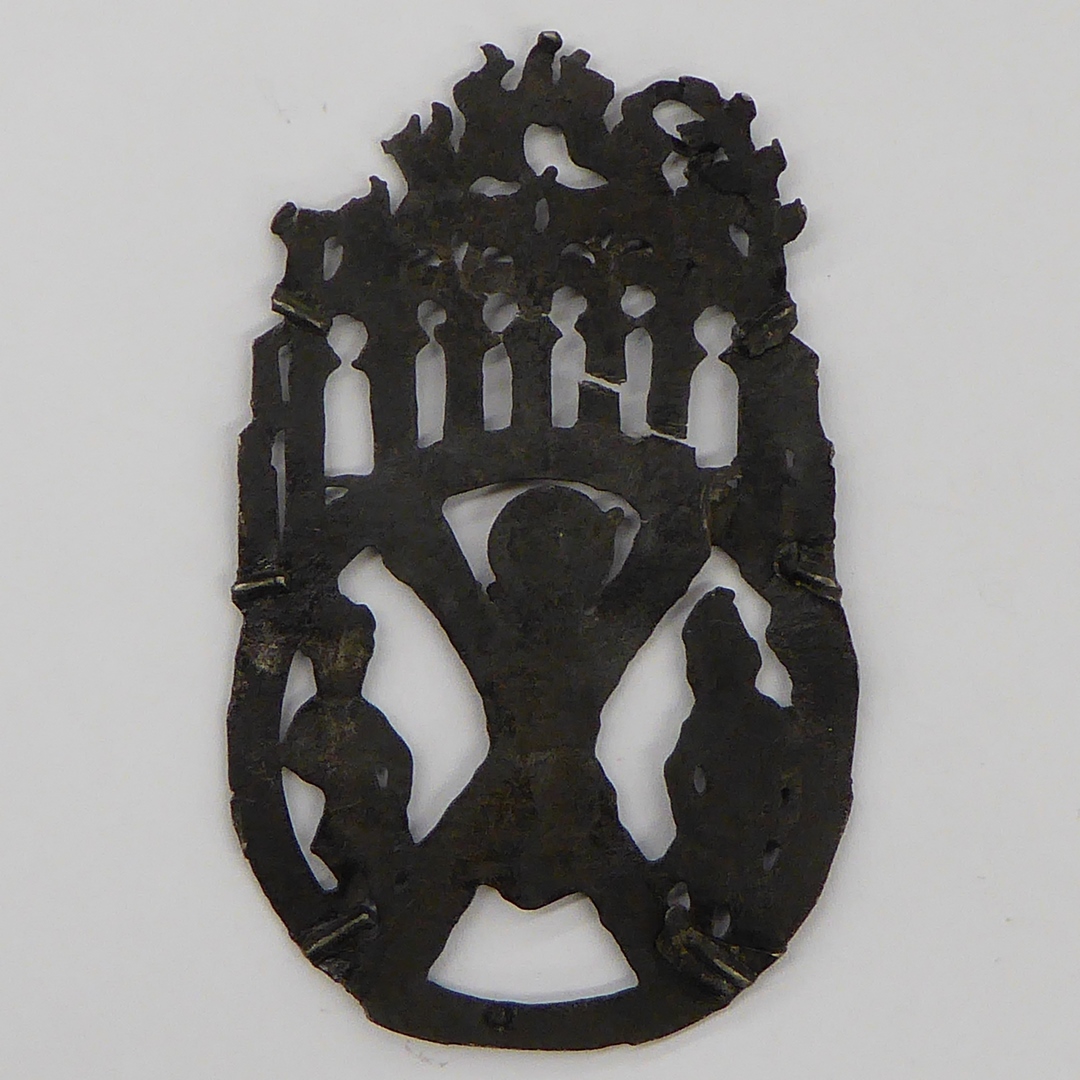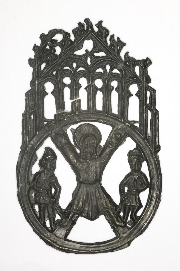 Pelgrimsinsigne met apostel Andreas, vastgebonden op Andreaskruis, met twee beulen