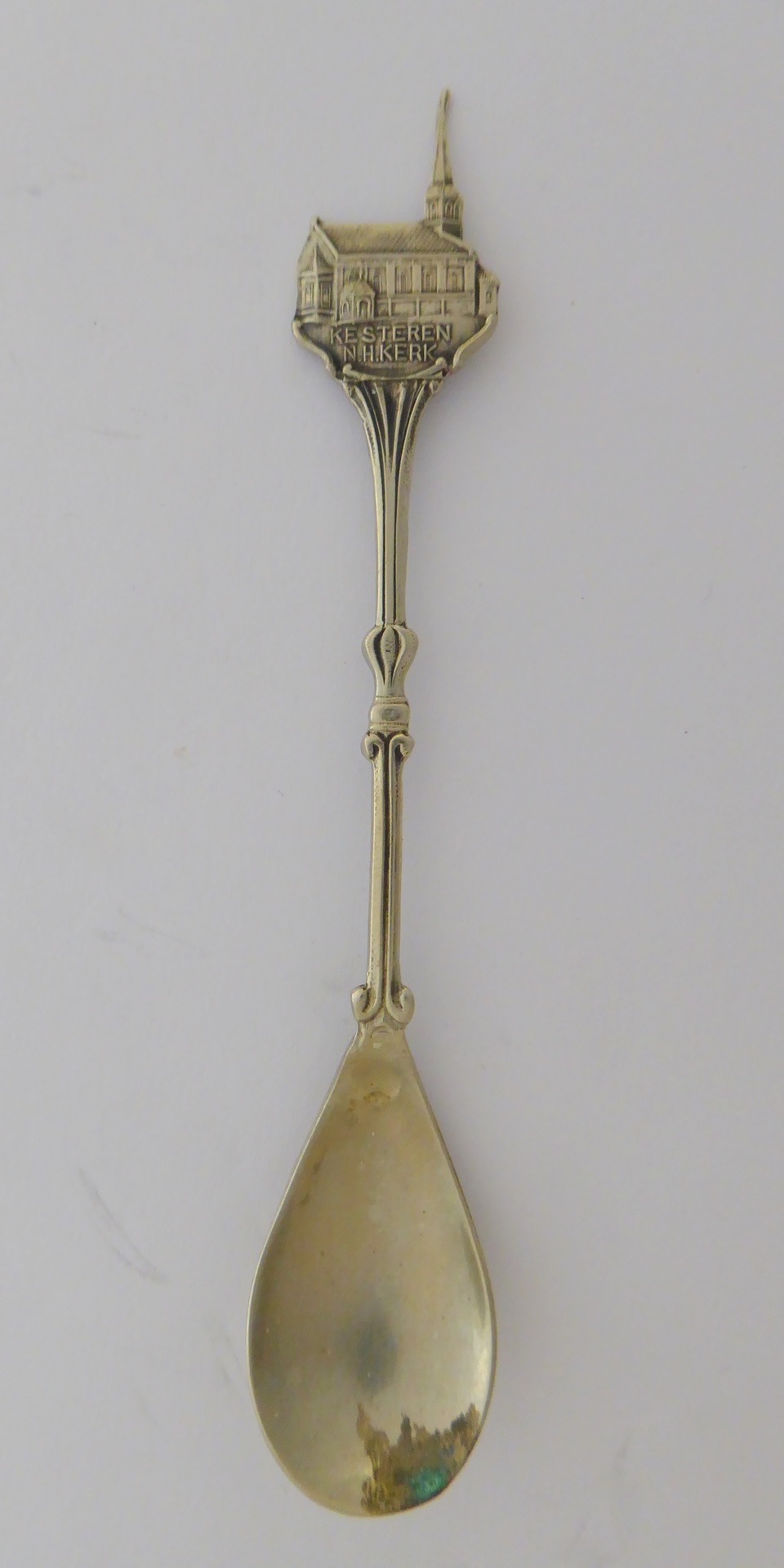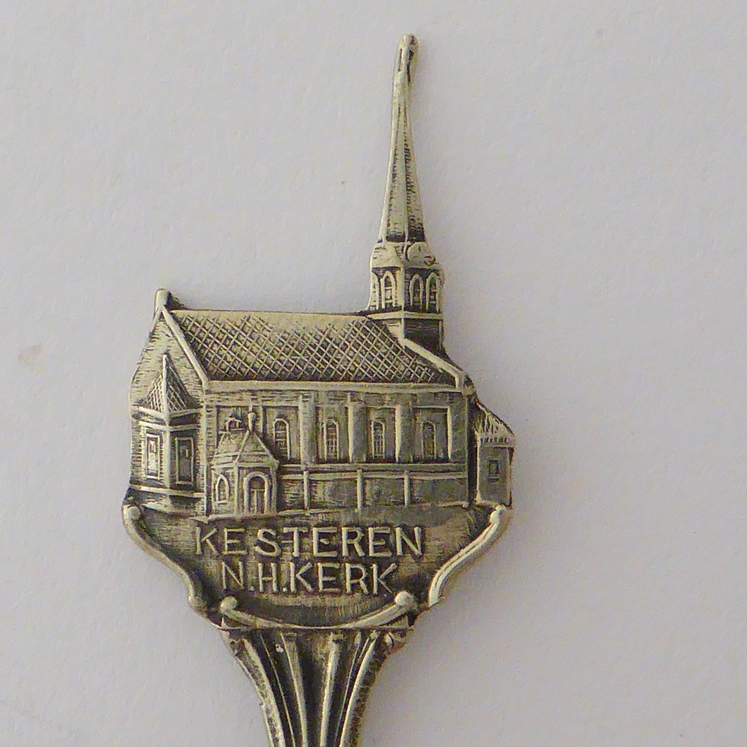 Theelepel met "Kesteren N.H. kerk" met kerkgebouw