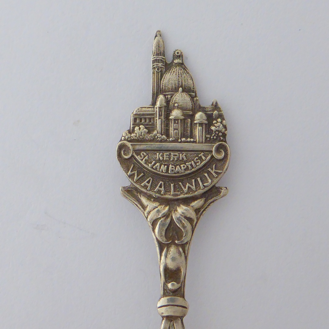Theelepel met "Waalwijk kerk St. Jan Baptist" met kerkgebouw