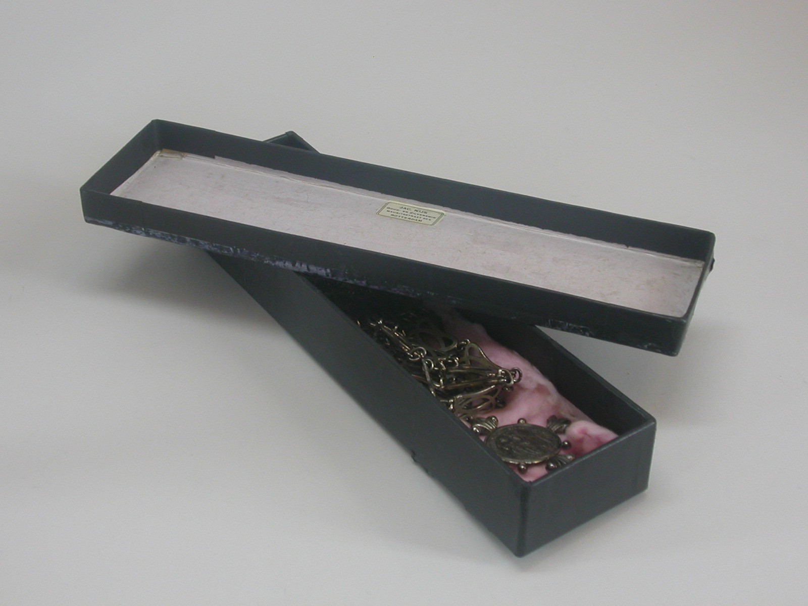 Met zwart papier beplakte doos voor RMCC m661a, met "Jac. Nijs goud- en zilversmid Mauritsstraat 92 B Rotterdam" aan binnenzijde deksel