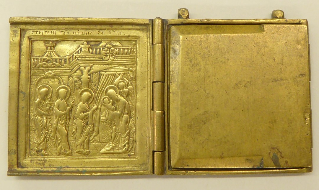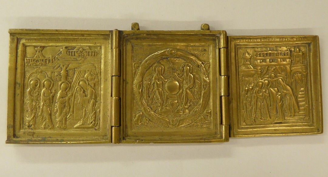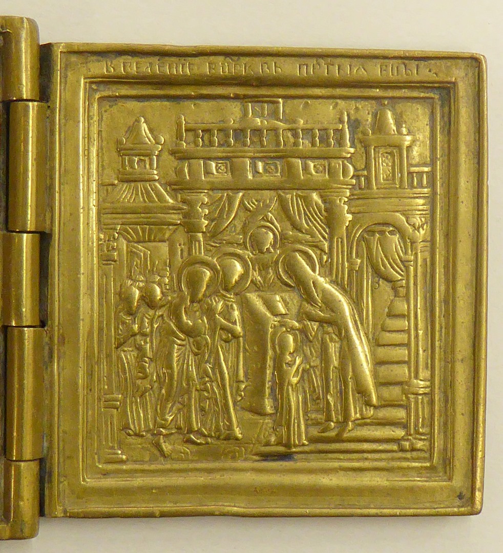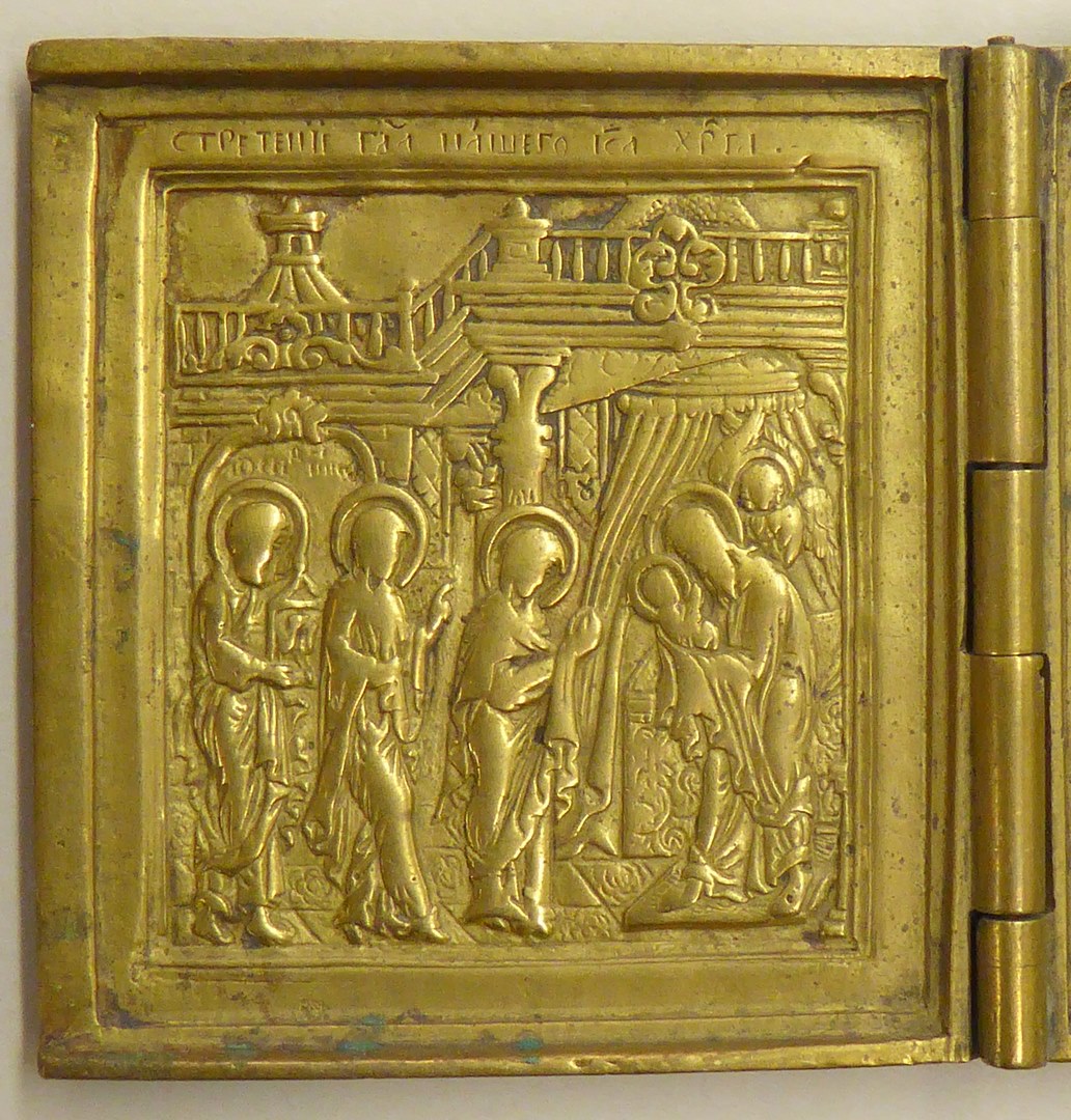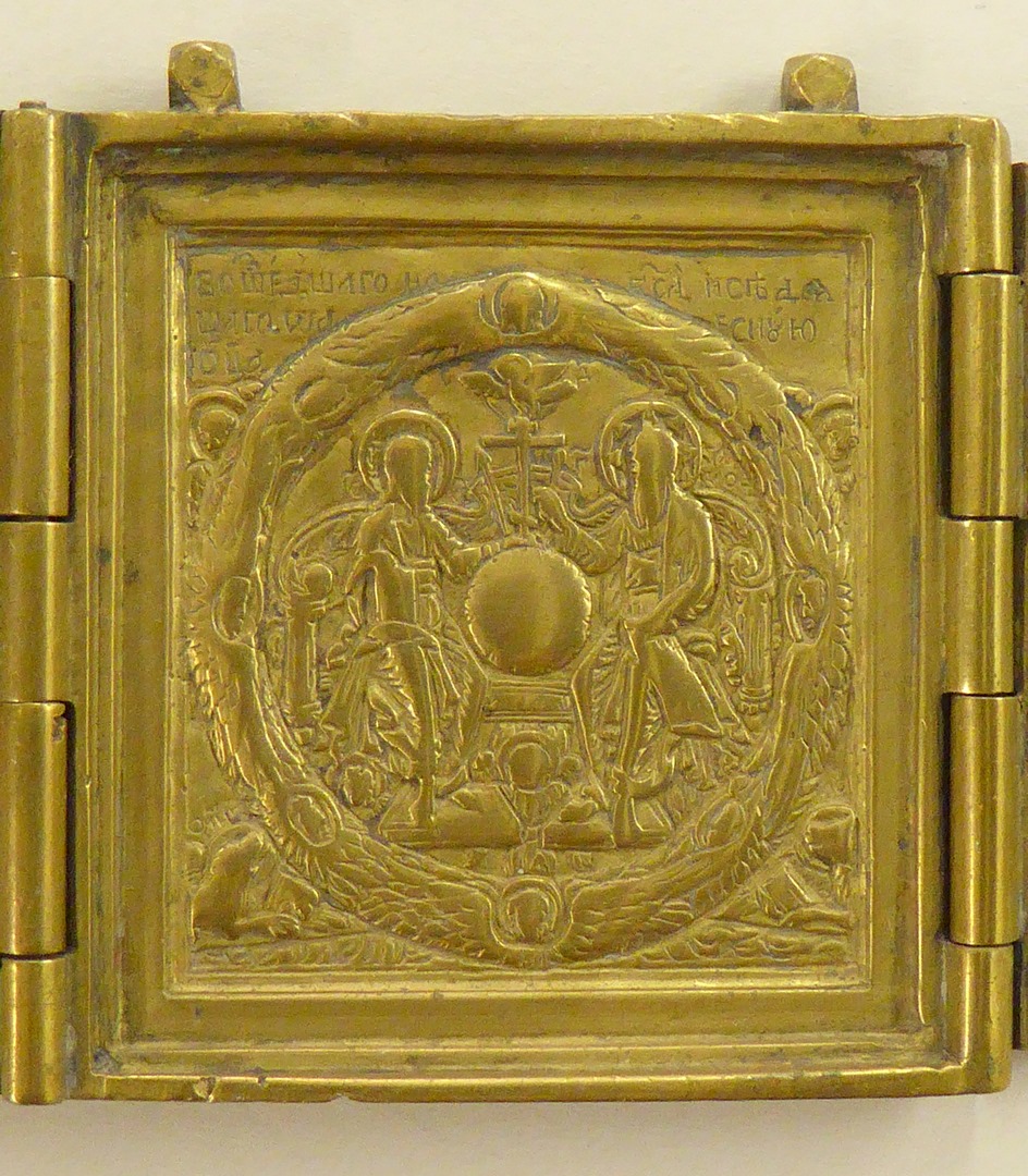 Drieluik met centraal nieuwtestamentische Triniteit, op linkerluik opdracht van Jezus in de tempel, op rechterluik presentatie van Moeder Gods in de tempel
