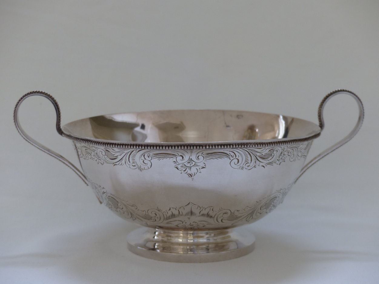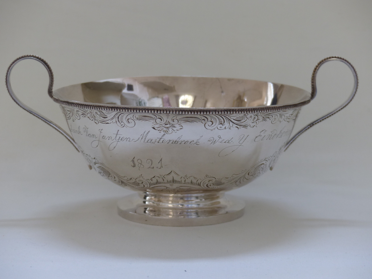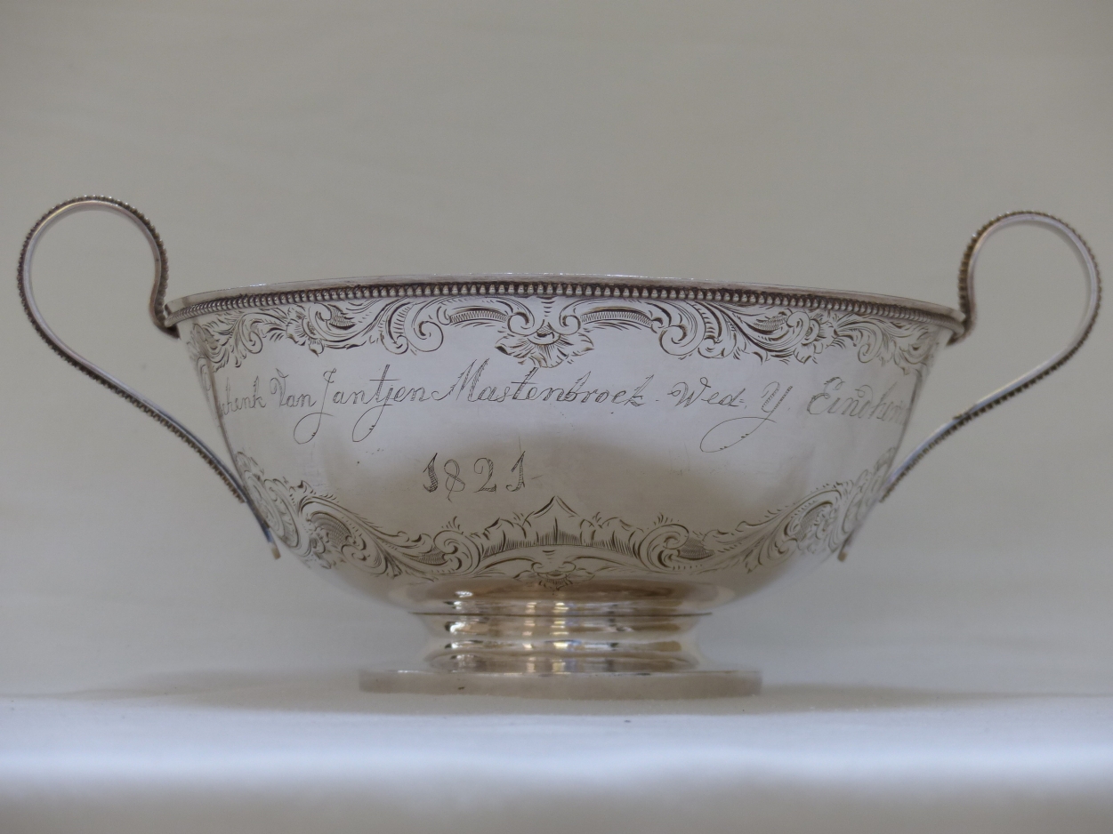 Doopbekken met parelrand op oren en bovenrand, met "Geschenk Van Jantjen Mastenbroek Wed. IJ Eindhoven / 1821"
