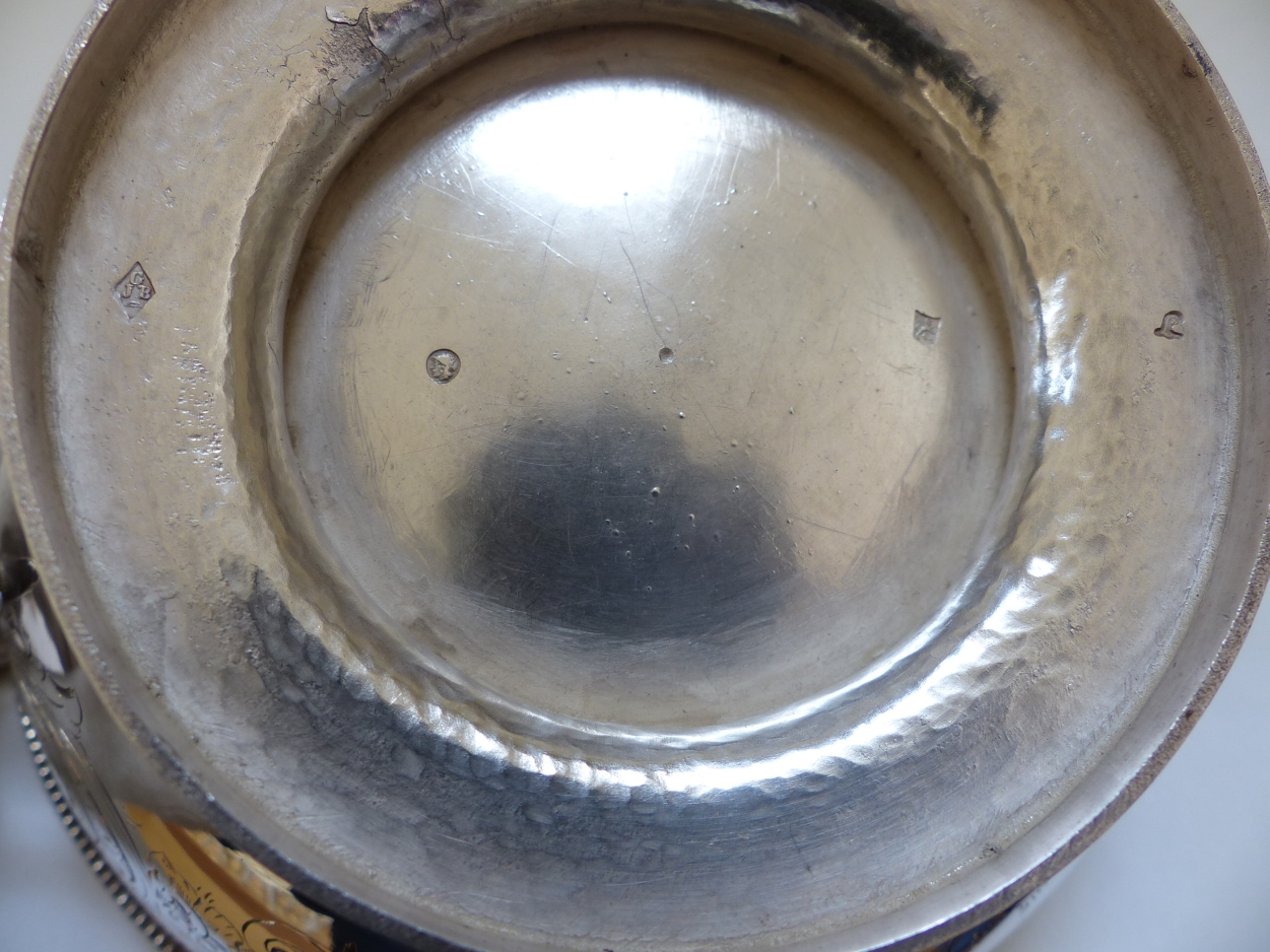 Doopbekken met parelrand op oren en bovenrand, met "Geschenk Van Jantjen Mastenbroek Wed. IJ Eindhoven / 1821".